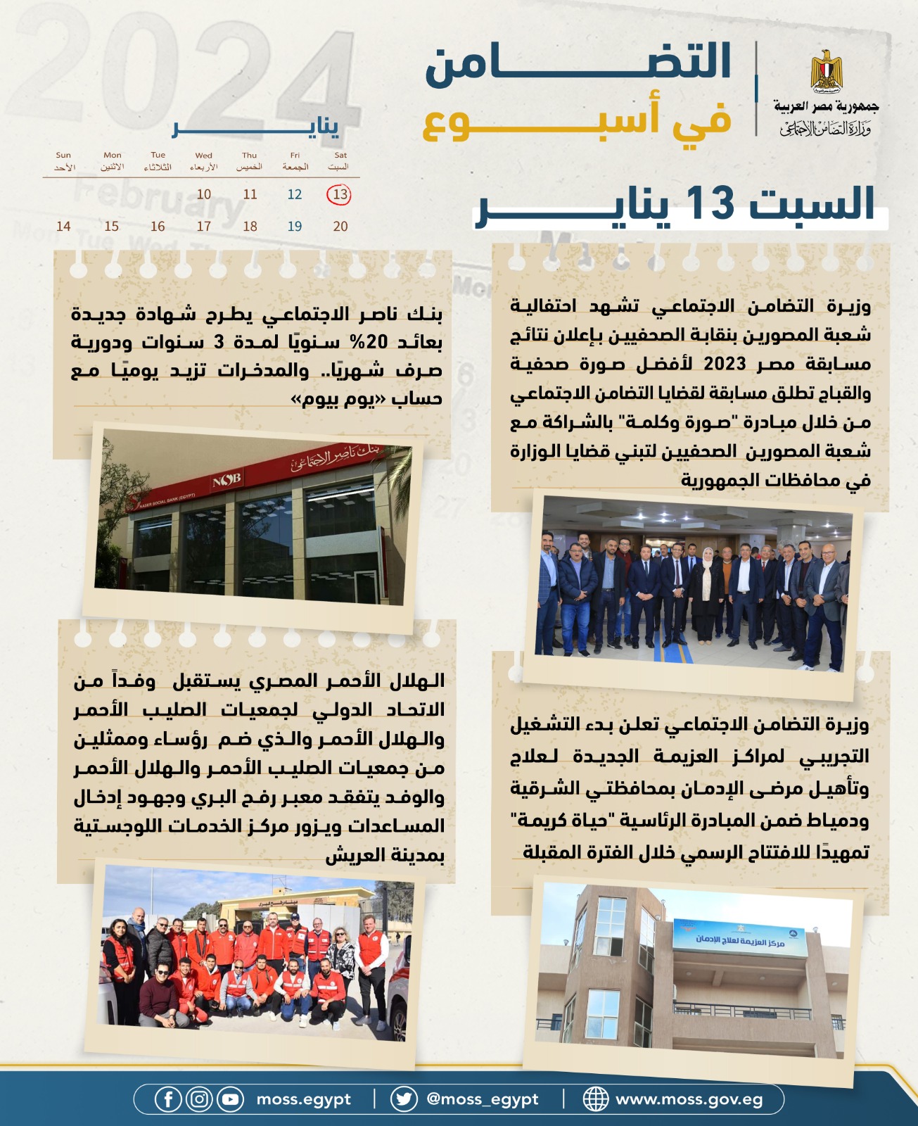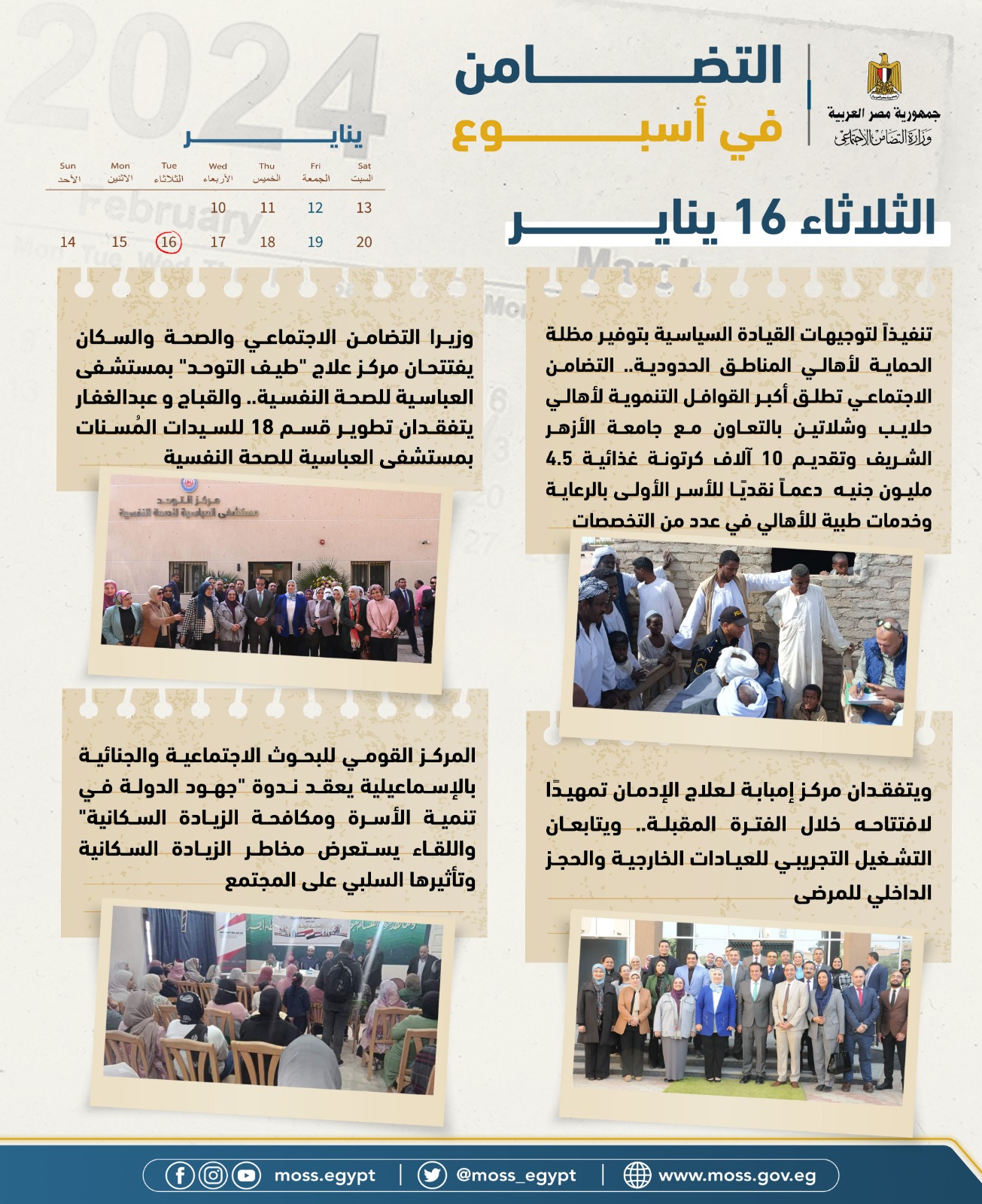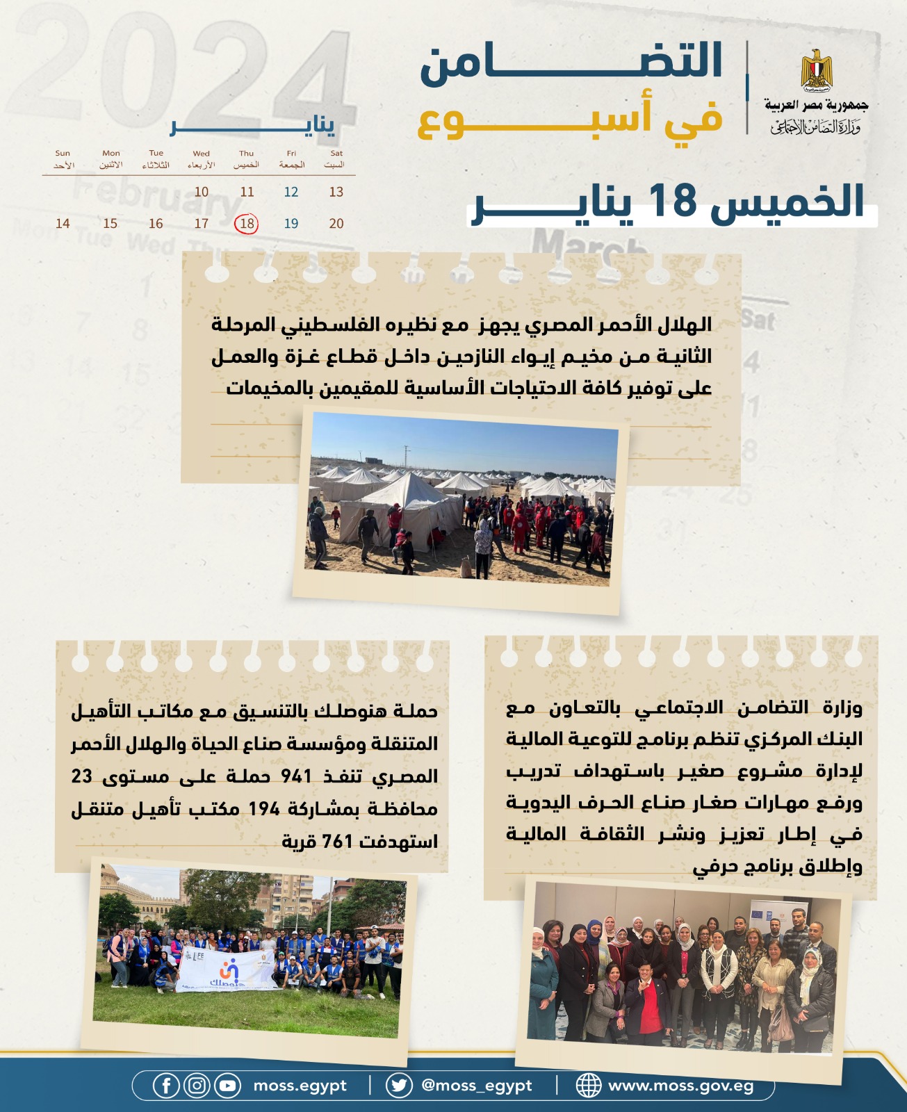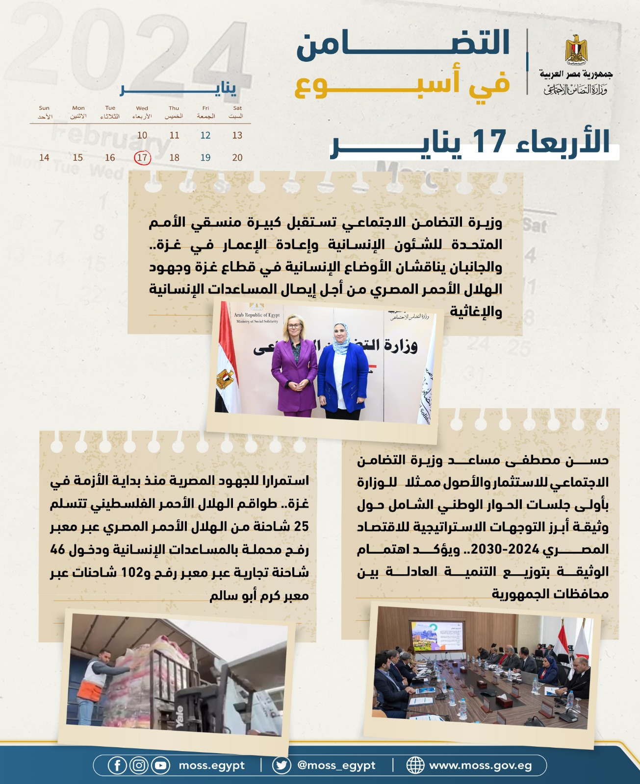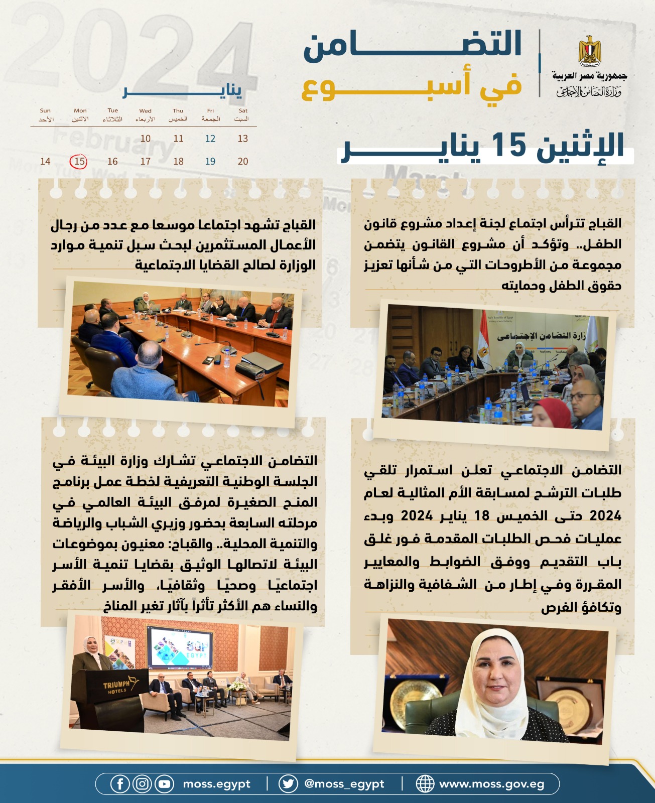 أصدرت وزارة التضامن الاجتماعي تقريرها الأسبوعي بالإنفوجراف والفيديو، وتستعرض من خلاله الأنشطة والأحداث، التي قامت بها نيفين القباج وزيرة التضامن الاجتماعي، وكذلك قطاعات الوزارة المختلفة خلال الفترة من 12 يناير إلى 18 يناير 2024 ونستعرض أبرزها في التقرير التالي: