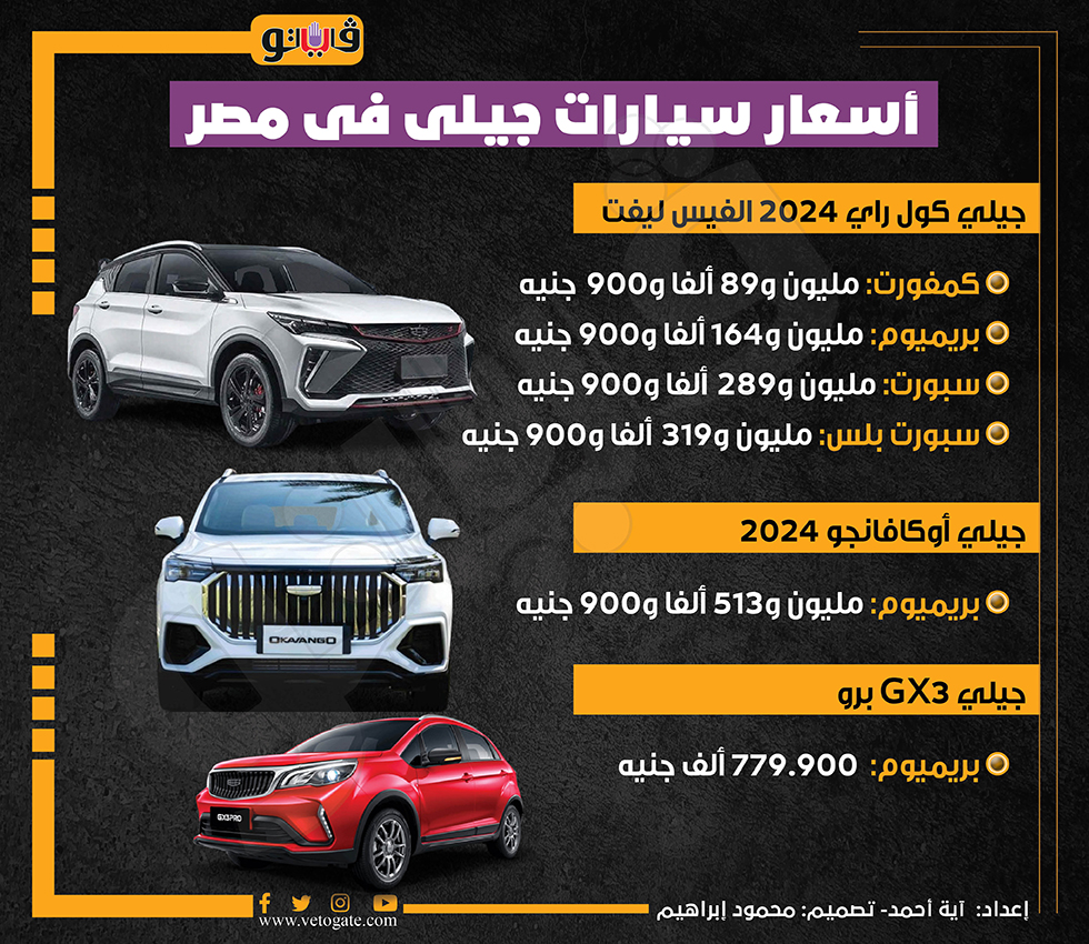 أسعار سيارات جيلى فى مصر (إنفوجراف) الثلاثاء 23/يناير/2024 - 11:00 م 1/23/2024 11:00:05 PM سيارات جيلي، فيتو آية أحمد شارك طباعة 18 حجم الخط شارك طباعة الفيس ليفت جيلي كول راي جيلي أوكافانجو سيارات جيلي أسعار سيارات جيلي