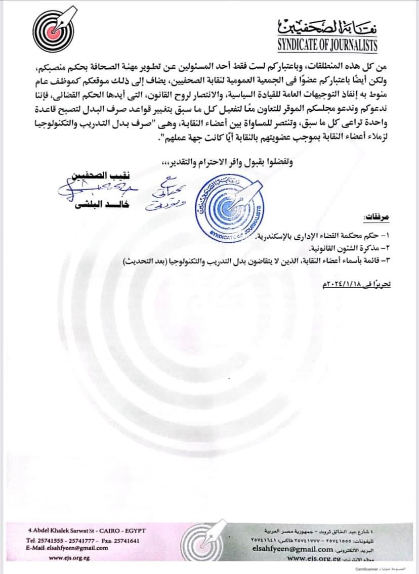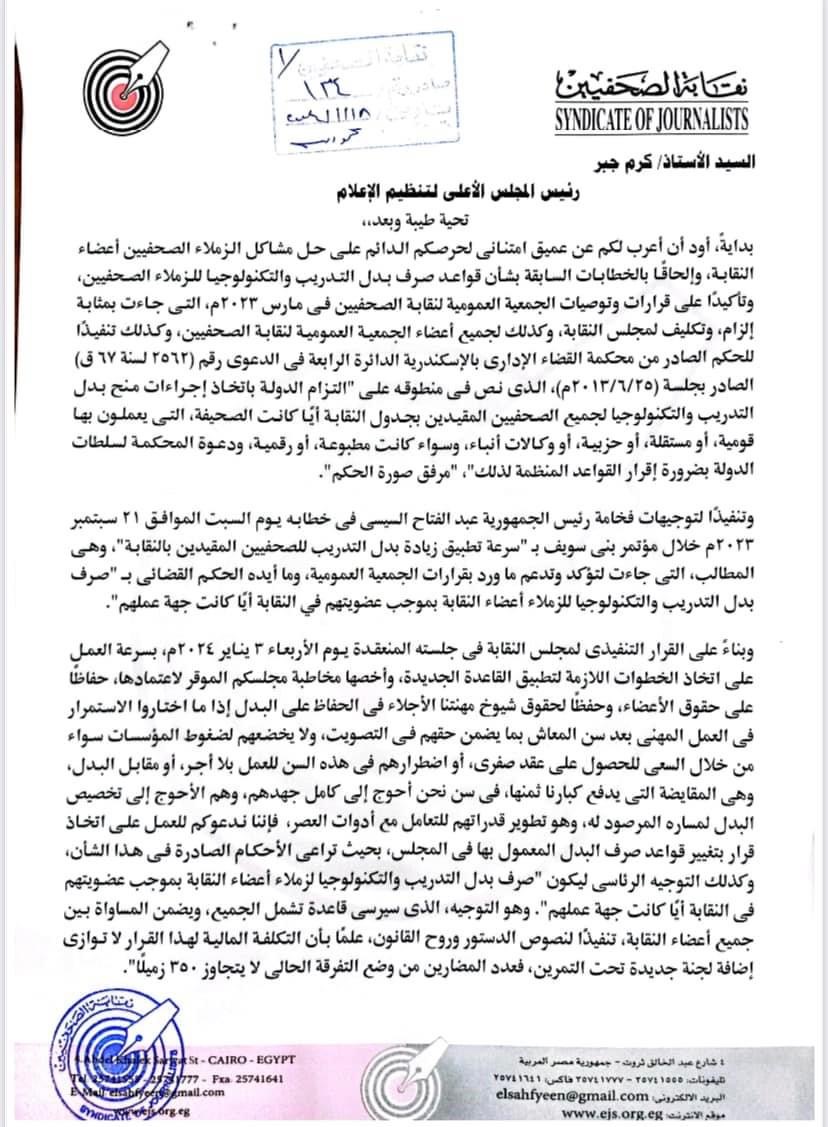 واختتم: "من كل هذه المنطلقات، وباعتباركم لست فقط أحد المسؤولين عن تطوير مهنة الصحافة بحكم منصبكم، ولكن أيضًا باعتباركم عضوًا في الجمعية العمومية لنقابة الصحفيين، يضاف إلى ذلك موقعكم كموظف عام منوط به إنفاذ التوجيهات العامة للقيادة السياسية، والانتصار لروح القانون، التي أيدها الحكم القضائي، فإننا ندعوكم وندعو مجلسكم الموقر للتعاون معًا لتفعيل كل ما سبق بتغيير قواعد صرف البدل لتصبح قاعدة واحدة تراعي كل ما سبق، وتنتصر للمساواة بين أعضاء النقابة، وهي "صرف بدل التدريب والتكنولوجيا لزملاء أعضاء النقابة بموجب عضويتهم بالنقابة أيًّا كانت جهة عملهم".