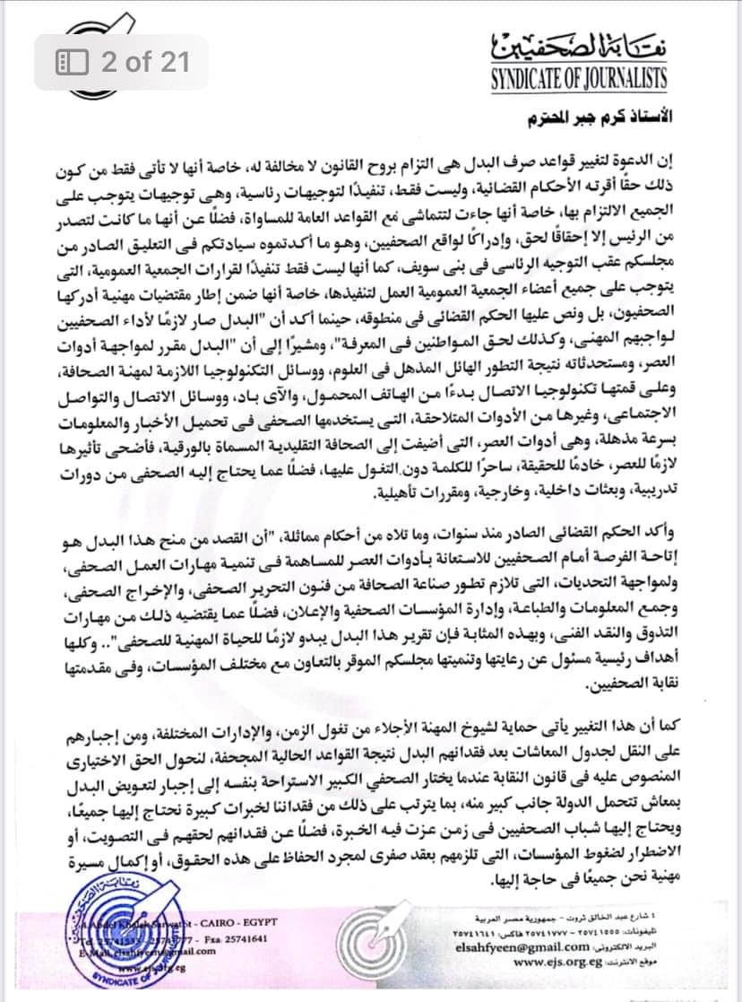 وقال:" إن الدعوة لتغيير قواعد صرف البدل هي التزام بروح القانون لا مخالفة له، خاصة أنها لا تأتي فقط من كون ذلك حقًا أقرته الأحكام القضائية، وليست فقط، تنفيذًا لتوجيهات رئاسية، وهي توجيهات يتوجب على الجميع الالتزام بها، خاصة أنها جاءت لتتماشى مع القواعد العامة للمساواة، فضلًا عن أنها ما كانت لتصدر من الرئيس إلا إحقاقًا لحق، وإدراكًا لواقع الصحفيين، وهو ما أكدتموه سيادتكم في التعليق الصادر من مجلسكم عقب التوجيه الرئاسي في بني سويف، كما أنها ليست فقط تنفيذًا لقرارات الجمعية العمومية، التي يتوجب على جميع أعضاء الجمعية العمومية العمل لتنفيذها، خاصة أنها ضمن إطار مقتضيات مهنية أدركها الصحفيون، بل ونص عليها الحكم القضائي في منطوقه، حينما أكد أن "البدل صار لازمًا لأداء الصحفيين لواجبهم المهنى، وكذلك لحق المواطنين في المعرفة"، ومشيرًا إلى أن “البدل مقرر لمواجهة أدوات العصر، ومستحدثاته نتيجة التطور الهائل المذهل في العلوم، ووسائل التكنولوجيا اللازمة لمهنة الصحافة، وعلى قمتها تكنولوجيا الاتصال بدءًا من الهاتف المحمول، والآي باد، ووسائل الاتصال والتواصل الاجتماعي، وغيرها من الأدوات المتلاحقة، التي يستخدمها الصحفي في تحميل الأخبار والمعلومات بسرعة مذهلة، وهي أدوات العصر، التي أضيفت إلى الصحافة التقليدية المسماة بالورقية، فأضحى تأثيرها لازمًا للعصر، خادمًا للحقيقة، ساحرًا للكلمة دون التغول عليها، فضلًا عما يحتاج إليه الصحفي من دورات تدريبية، وبعثات داخلية، وخارجية، ومقررات تأهيلية".