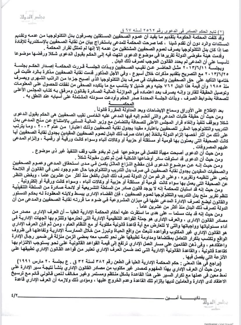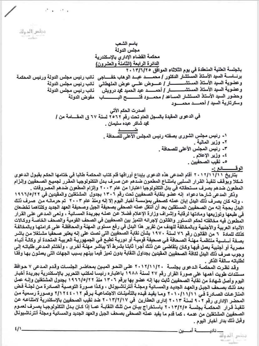 وأضاف:"وكذلك تنفيذًا للحكم الصادر من محكمة القضاء الإداري بالإسكندرية الدائرة الرابعة في الدعوى رقم (2562 لسنة 67 ق) الصادر بجلسة (25/6/2013م)، الذي نص في منطوقه على "التزام الدولة باتخاذ إجراءات منح بدل التدريب والتكنولوجيا لجميع الصحفيين المقيدين بجدول النقابة أيًّا كانت الصحيفة التي يعملون بها قومية، أو مستقلة، أو حزبية، أو وكالات أنباء، وسواء كانت مطبوعة، أو رقمية، ودعوة المحكمة لسلطات الدولة بضرورة إقرار القواعد المنظمة لذلك"، "مرفق صورة الحكم".