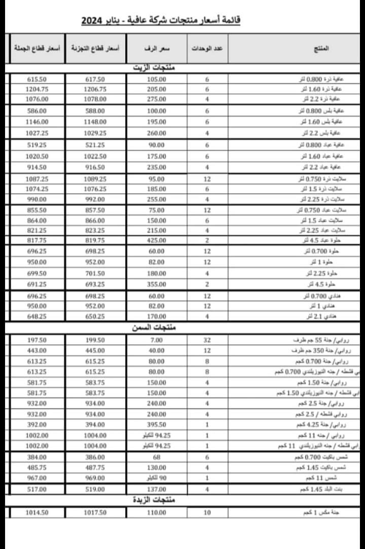 أسعار زيت عافية عباد بعد الزيادة الجديدة في يناير