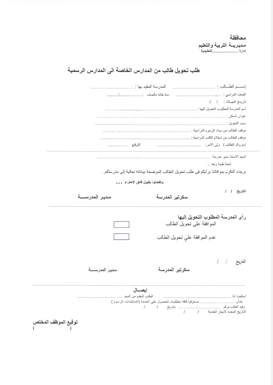1) طلب تحويل، ويمكن الحصول عليه من المدارس والإدارات التعليمية.