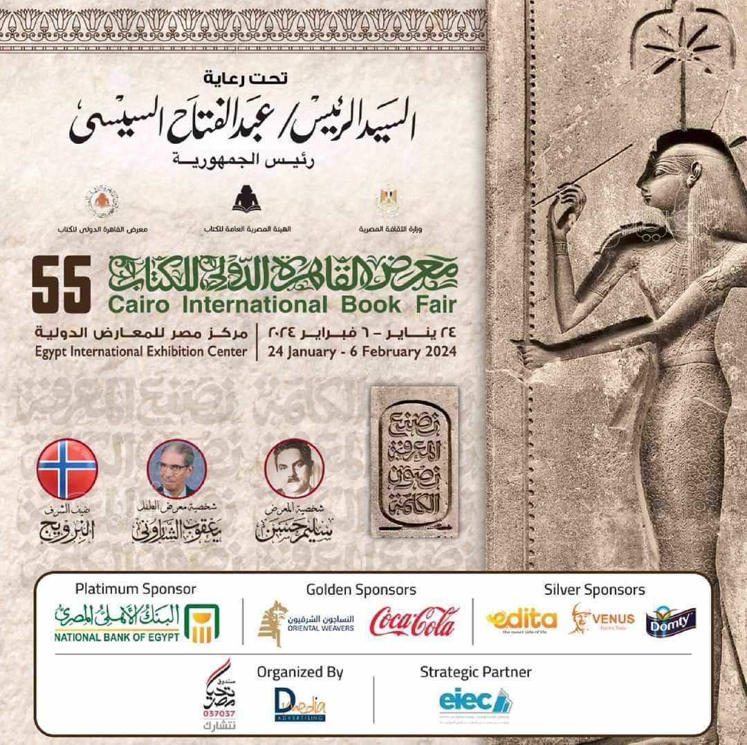وعن بوستر معرض الكتاب الـ 55، قال الدكتور أشرف رضا، أستاذ الفنون الجميلة، مصمم بوستر معرض القاهرة الدولي للكتاب الـ55 لعام ٢٠٢٤: "إن التصميم هذا العام اتخذ روح الفن المصري القديم، دمجًا مع فن الخط العربي، ويتصدر التصميم نحت بارز للمعبودة "سيشات" إلهة الحكمة والمعرفة والكتابة في مصر القديمة، حيث يرجع لها الفضل في اختراع الكتابة، وارتبط اسمها بمجالات علم الفلك والمعمار والبناء والرياضيات، وهي المجالات المعتمدة أساسًا على مهارات الكتابة والتدوين، وعلى جانب التصميم يظهر شخصية المعرض هذا العام سليم حسن (١٨٩٣-١٩٦١)، أحد رواد علم الآثار، وصاحب موسوعة "مصر القديمة"، والعديد من الدراسات الرائدة في هذا المجال، ويليه شخصية معرض الطفل يعقوب الشاروني (١٩٣١-٢٠٢٣)، أحد رواد أدب الأطفال في مصر والعالم العربي، ثم تأتي ضيف شرف المعرض مملكة النرويج، أما خلفية التصميم فتبدو كالبرديات القديمة، ولكن بعلامات مائية بالخط العربي تحمل شعار الدورة في إيقاع متكرر (نصنع المعرفة... نصون الكلمة)».
