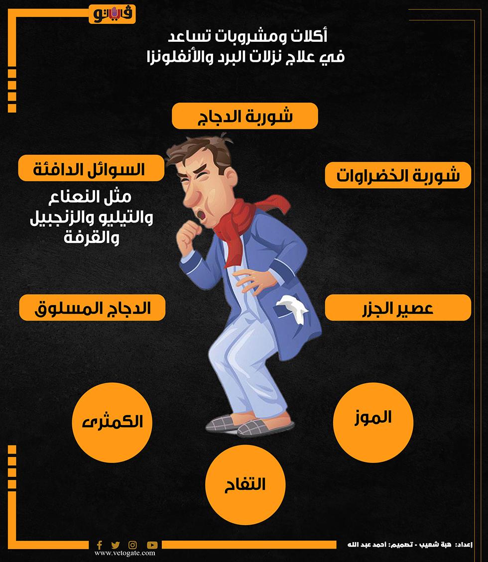 أكلات ومشروبات تساعد في علاج نزلات البرد والأنفلونزا (انفوجراف) الإثنين 22/يناير/2024 - 01:11 م 1/22/2024 1:11:50 PM نزلات البرد عند الأطفال، فيتو هبة شعيب شارك طباعة 18 حجم الخط شارك طباعة نزلات البرد علاج نزلات البرد أكلات ومشروبات تساعد في علاج نزلات البرد والأنفلونزا الدكتور محمد حلمى صحة الصحة