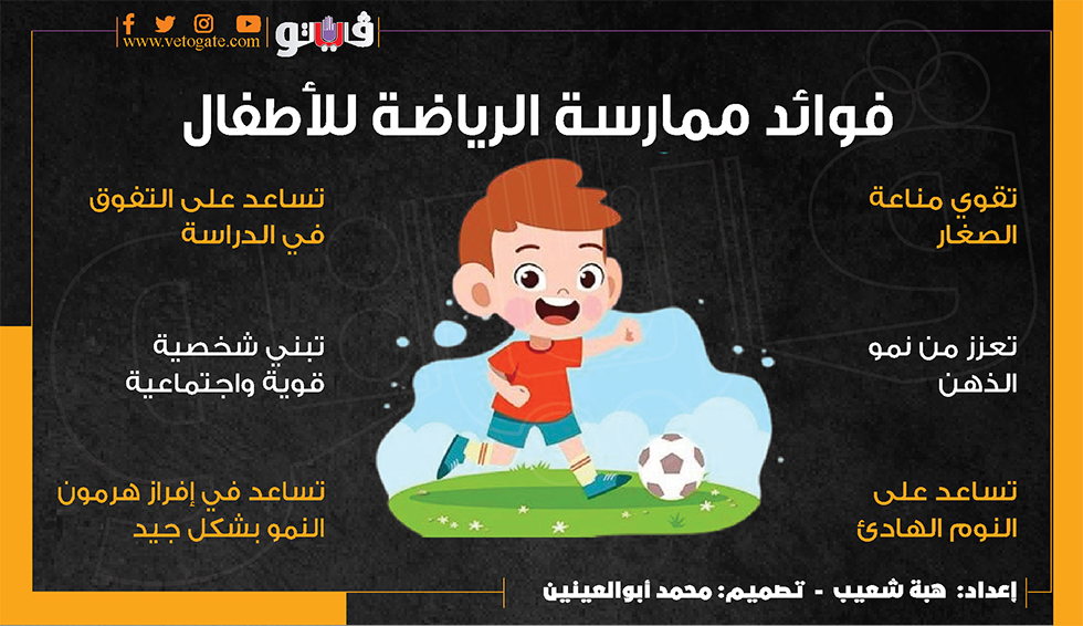 فوائد ممارسة الرياضة للأطفال (إنفوجراف) الجمعة 09/فبراير/2024 - 05:30 م 2/9/2024 5:30:52 PM فوائد ممارسة الرياضة، فيتو هبة شعيب شارك طباعة 18 حجم الخط شارك طباعة ممارسة الرياضة فوائد ممارسة الرياضة للأطفال الدكتور تامر عبد الحميد الرياضة