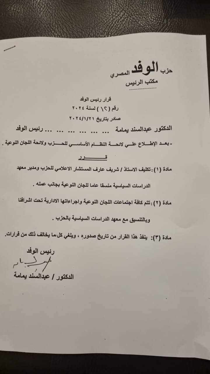 أصدر الدكتور عبد السند يمامة رئيس حزب الوفد قرارا بتعيين الكاتب الصحفى شريف عارف منسقا عاما للجان النوعية فى حزب الوفد.