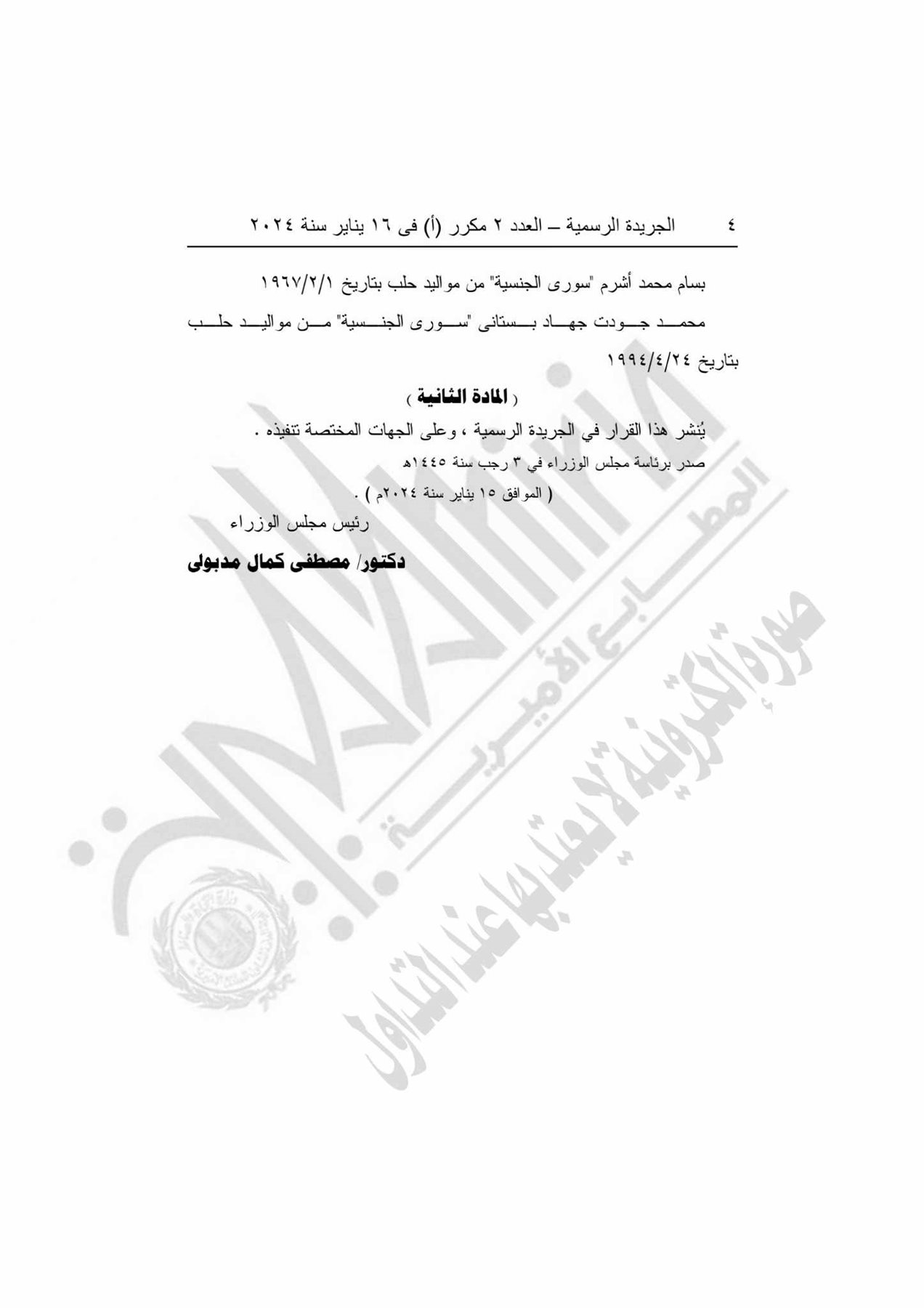 كما تضمن القرار الموافقة على منح الجنسية لـ بسام محمد أشرم سورى الجنسية، من مواليد 1967، ومحمد جودت جهاد بستاني، سوري الجنسية من مواليد 1994.