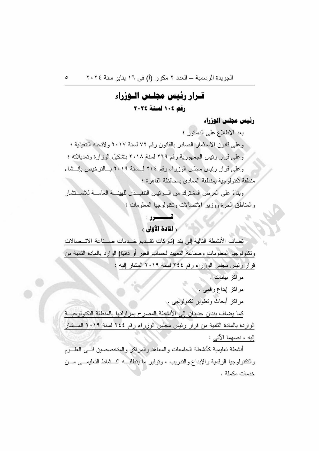 و نشرت الجريدة الرسمية في العدد الأول مكرر "أ" الصادر في سنة 2024، قرار رئيس مجلس الوزراء رقم 104 لسنة 2024.