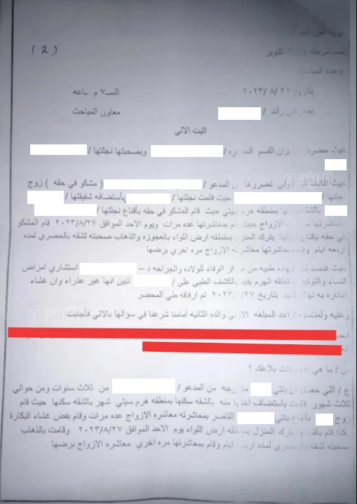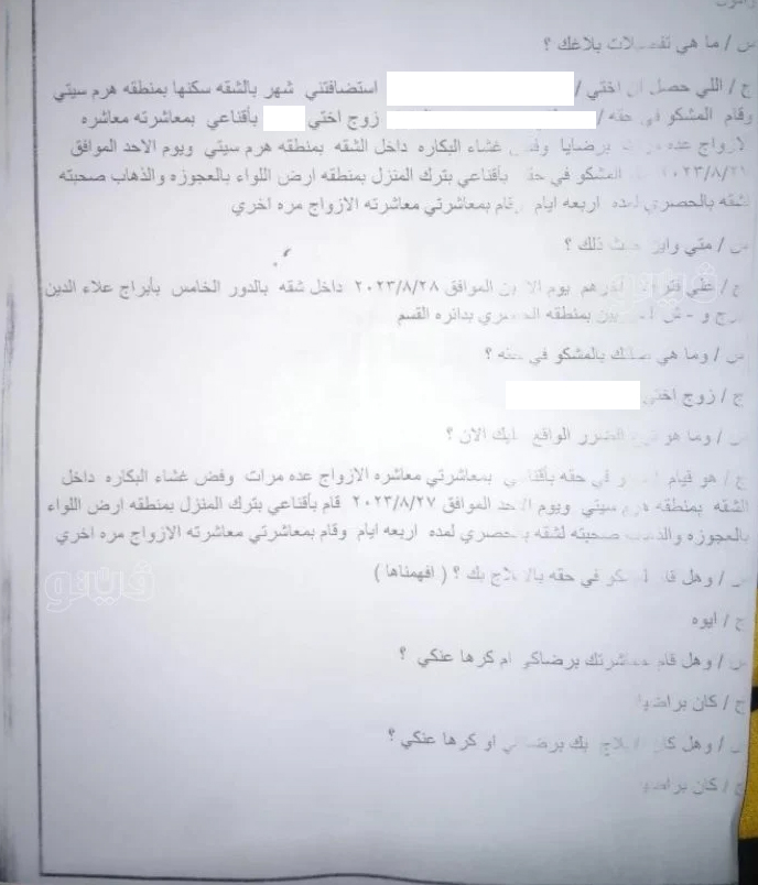 اللي حصل إن أختي “س” استضافتني شهر بالشقة سكنها بمنطقة هرم سيتي، وقام زوج أختي بإقناعي بمعاشرته معاشرة الأزواج عدة مرات برضايا داخل الشقة بمنطقة هرم سيتي، ويوم الأحد الموافق 2023/8/27، أقنعني زوج أختي بترك المنزل بمنطقة أرض اللواء بالعجوزة والذهاب صحبته شقة بالحصري 4 أيام، وقام بمعاشرتي معاشرة الأزواج مرة أخرى.