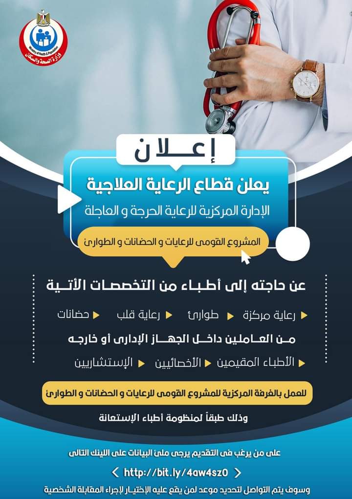 أعلن قطاع الرعاية العلاجية من خلال الإدارة المركزية الحرجة والعاجلة والمشروع القومي للرعاية والحضانات والطوارئ عن الحاجة إلى أطباء من التخصصات الآتية: