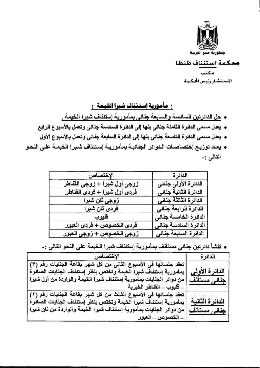 كما يعاد توزيع اختصاصات الدوائر الجنائية بمأمورية استئناف بنها، وفقا للقرار: