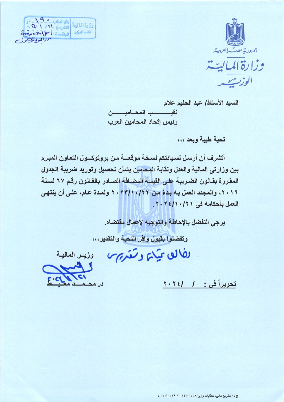 قام نقيب المحامين، عبدالحليم علام ـ رئيس اتحاد المحامين العرب، بالتوقيع على تجديد بروتوكول القيمة المضافة مع؛ المستشار وزير العدل، الدكتور عمر مروان، ووزير المالية، الدكتورمحمد معيط، وذلك بشأن تحصيل وتوريد ضريبة الجدول المقررة بقانون الضريبة على القيمة المضافة، الصادر بالقانون رقم 67 لسنة 2016.