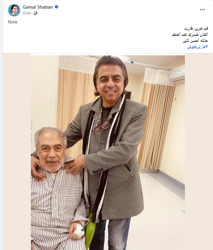 وكتب الدكتور جمال شعبان تدوينة على الفيس بوك عن الحالة الصحية للفنان صبري عبد المنعم قال فيها: "الفنان صبري عبد المنعم حالته أحسن كتير #ما_تزعلوش"
