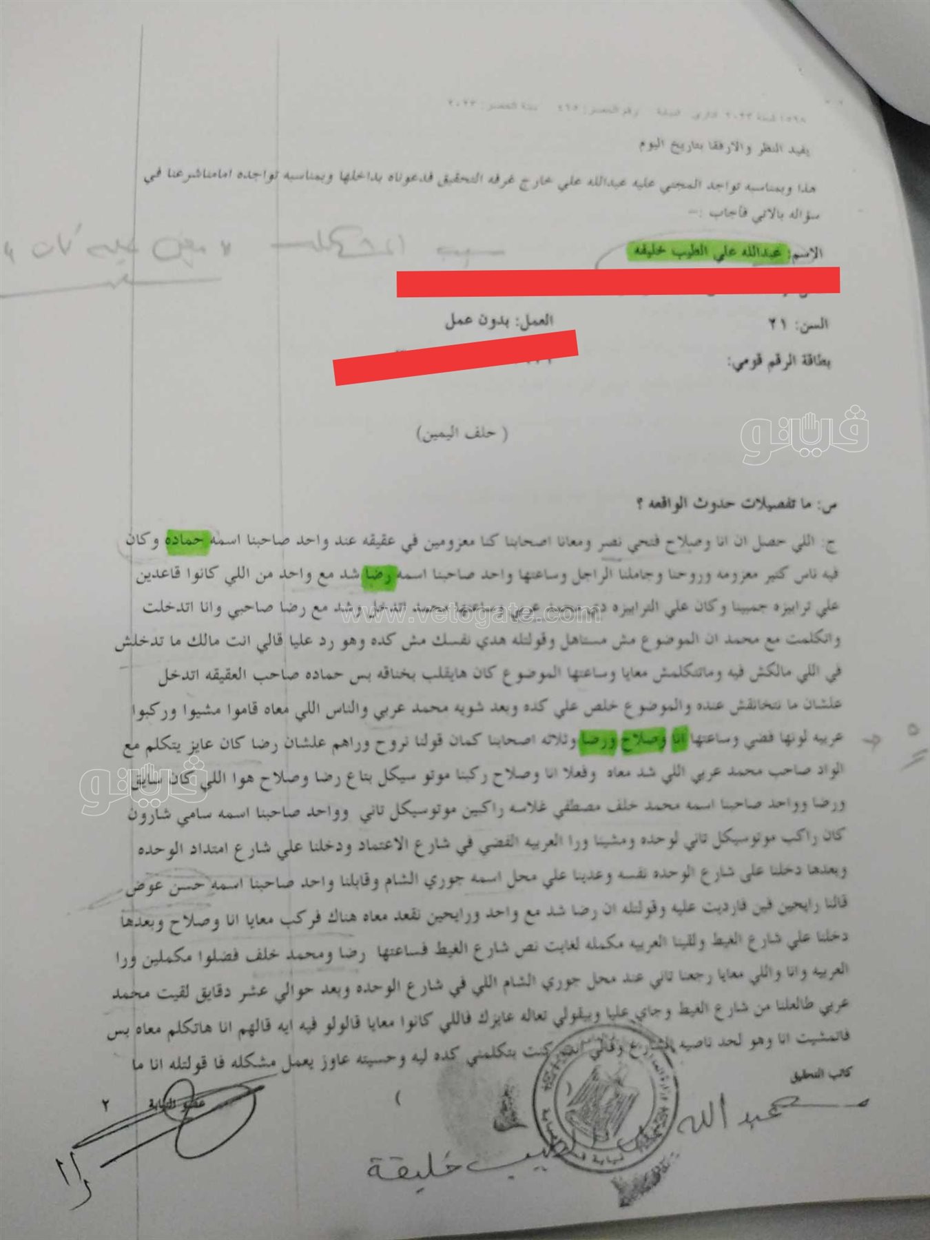فيما يلي استعراض لأقوال عبدالله.ع السن ٢١ عاما إمبابة الجيزة، المجني عليه الثاني "مصاب"