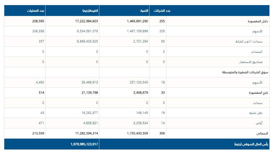 وارتفع مؤشر الشركات الصغيرة والمتوسطة "إيجي إكس 70 متساوي الأوزان" بنسبة 0.12% عند مستوى 6485 نقطة، وصعد مؤشر "إيجي إكس 100 متساوي الأوزان" بنسبة 0.14% عند مستوى 9255 نقطة.
