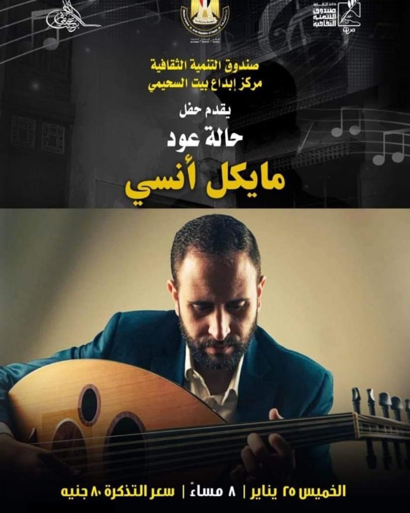 يقيم مركز الإبداع الفني في بيت السحيمى، بشارع المعز، والتابع لقطاع صندوق التنمية الثقافية برئاسة الدكتور وليد قانوش، في الثامنة من مساء الخميس المقبل الموافق 25 يناير الجاري، حفلا موسيقيًا للفنان مايكل أنسي.