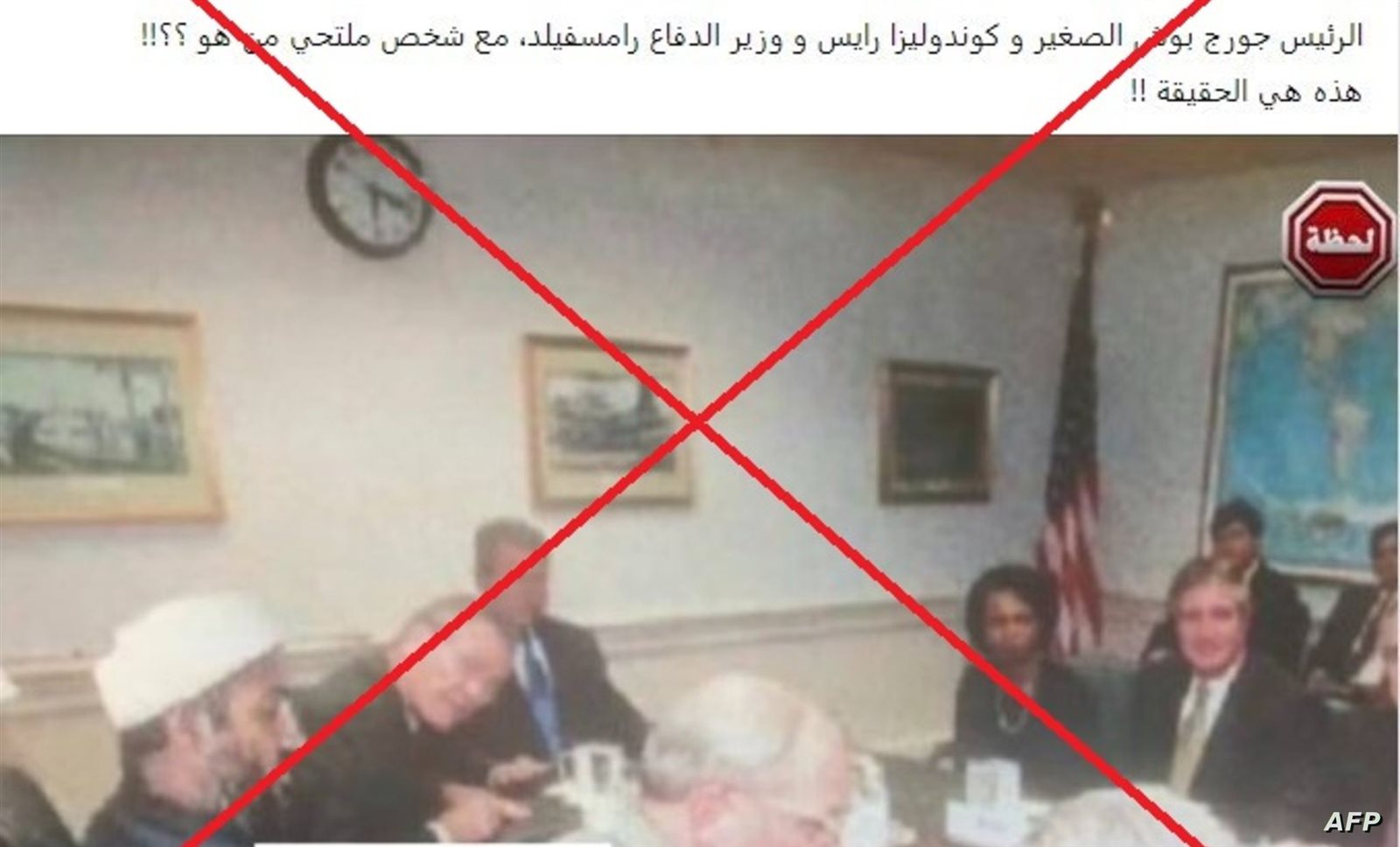 وتُظهر الصورة ما يبدو أنّه اجتماع بحضور كبار إدارة الرئيس الأمريكي السابق جورج بوش إلى جانب أسامة بن لادن، وجاء في التعليقات: «الرئيس جورج بوش الصغير وكوندوليزا رايس ووزير الدفاع رامسفيلد، مع شخص ملتح من هو؟».