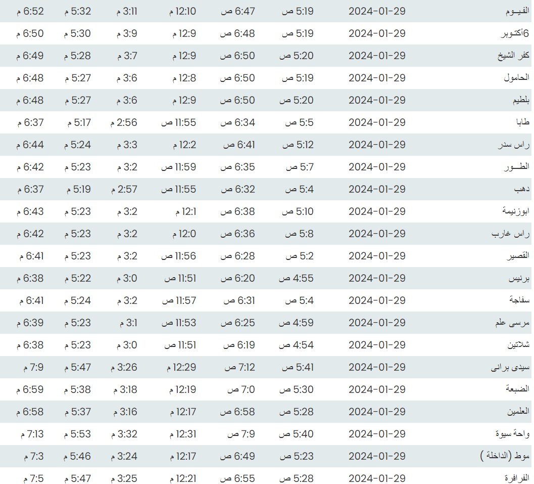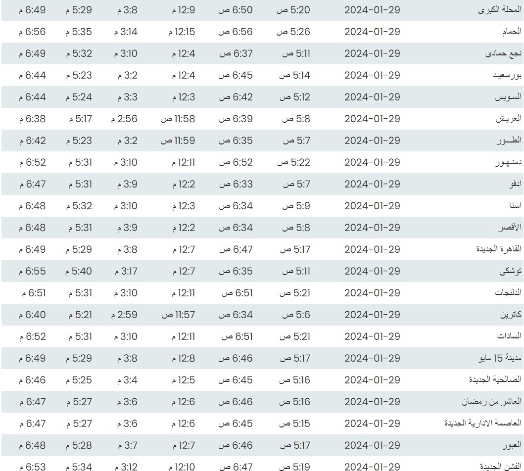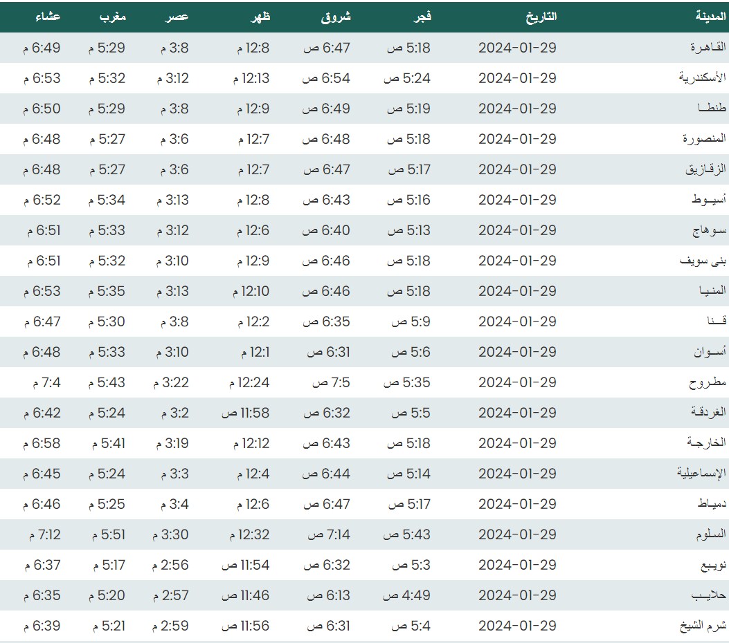 وفيما يلي مواقيت الصلاة، لعدد من مدن ومحافظات الجمهورية من واقع بيانات الهيئة العامة للمساحة