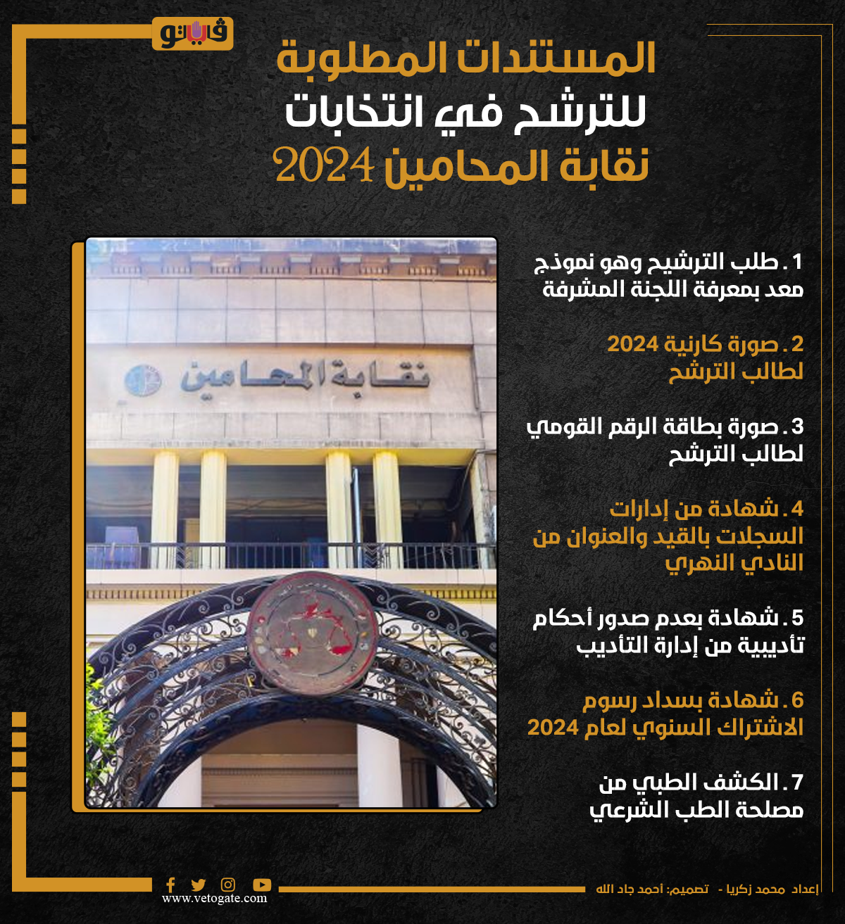 المستندات المطلوبة للترشح في انتخابات نقابة المحامين 2024 (إنفوجراف) الثلاثاء 23/يناير/2024 - 12:20 م 1/23/2024 12:20:47 PM نقابة المحامين، فيتو محمد زكريا شارك طباعة 18 حجم الخط شارك طباعة الطب الشرعي المستندات المطلوبة انتخابات نقابة المحامين انفوجراف مصلحة الطب الشرعي طاقة الرقم القومي اللجنة المشرفة