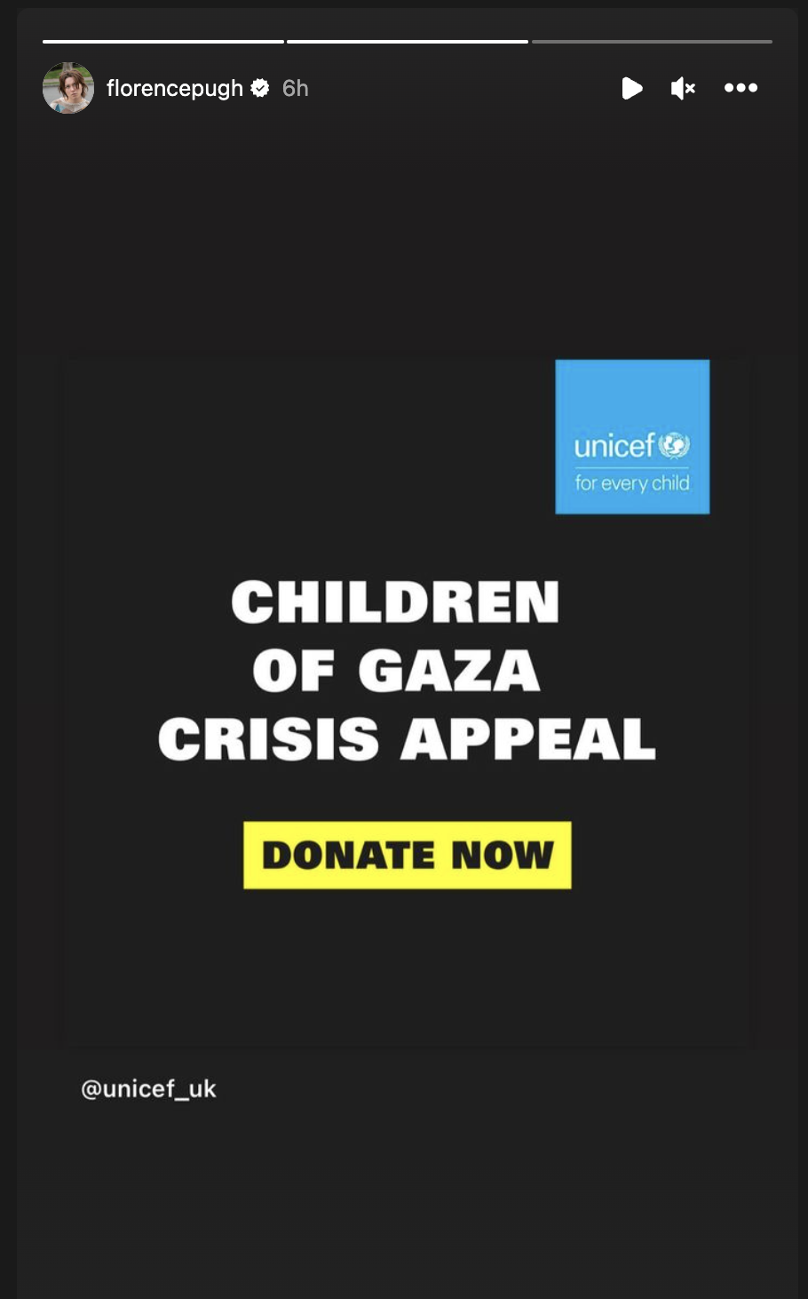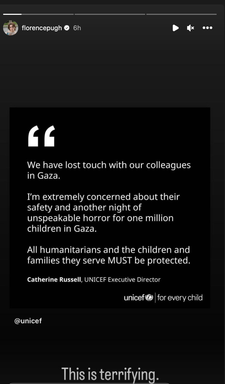ووصفت الممثلة البريطانية، الوضع بعد قطع الاتصالات في غزة عن ما يقرب من ٢ مليون شخص، بالمرعب، وطالبت بالتبرع لأطفال فلسطين، عبر وضعها رابط تبرع اليونيسيف، في خاصية الاستوري، بحسابها الرسمي علي موقع “انستجرام”.