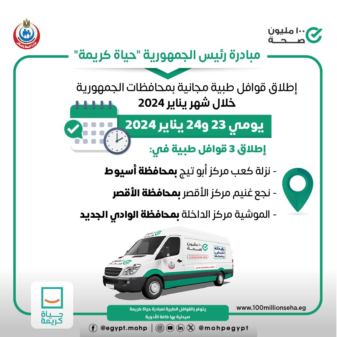 أعلنت وزارة الصحة إطلاق ٣ قوافل طبية ضمن مبادرة رئيس الجمهورية حياة كريمة يومي ٢٣ و٢٤ يناير ٢٠٢٤، للكشف والعلاج مجانًا في التخصصات الطبية " نساء وولادة - خدمات تنظيم الأسرة – الأطفال والباطنة - الأنف والأذن، والعظام - الجراحة - الرمد الأسنان - القلب – الجلدية وخدمات الأشعة والتحاليل.