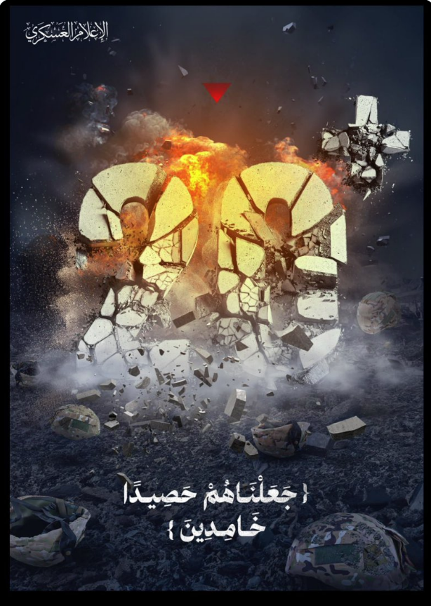 كتائب القسام، نشرت كتائب القسام صورة غامضة عبارة عن نار وأحجار محطمة كُتب عليها "جعلناهم حصيدا خامدين" .