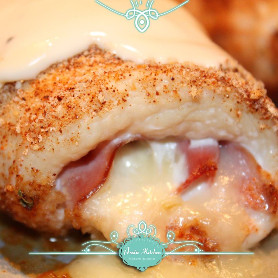 ضعى شريحة الجبنة وشريحة التركى المدخن أو اللانشون، على كل صدر فى حدود ½ بوصة من الأطراف.