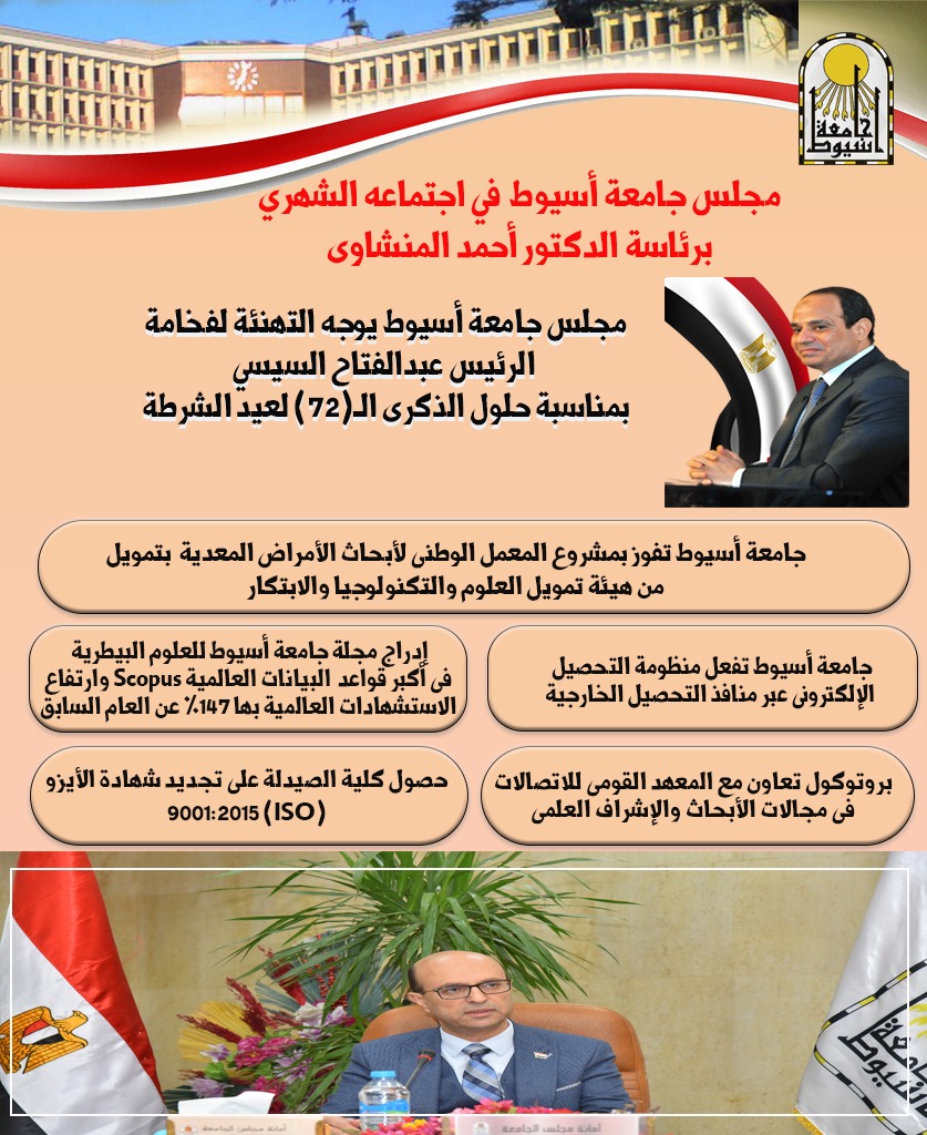 وفى مستهل الاجتماع، توجه الدكتور أحمد المنشاوي، باسم جامعة أسيوط، وأعضاء مجلس الجامعة، بخالص التهنئة إلى الرئيس عبد الفتاح السيسي والشعب المصري بالذكرى ال(72) لعيد الشرطة،وحلول الذكرى الثالثة عشرة لثورة 25 من يناير، وهو اليوم العظيم الذي خُلِّد فى تاريخ المصريين عام 1952، حين جسدت الشرطة المصرية، فى معركة الإسماعيلية المجيدة، أروع صور البطولة والفداء، دفاعًا عن أرض مصر وأمنها، فلم ينس لها الشعب فضلها فاتخذه عيدًا لها.
