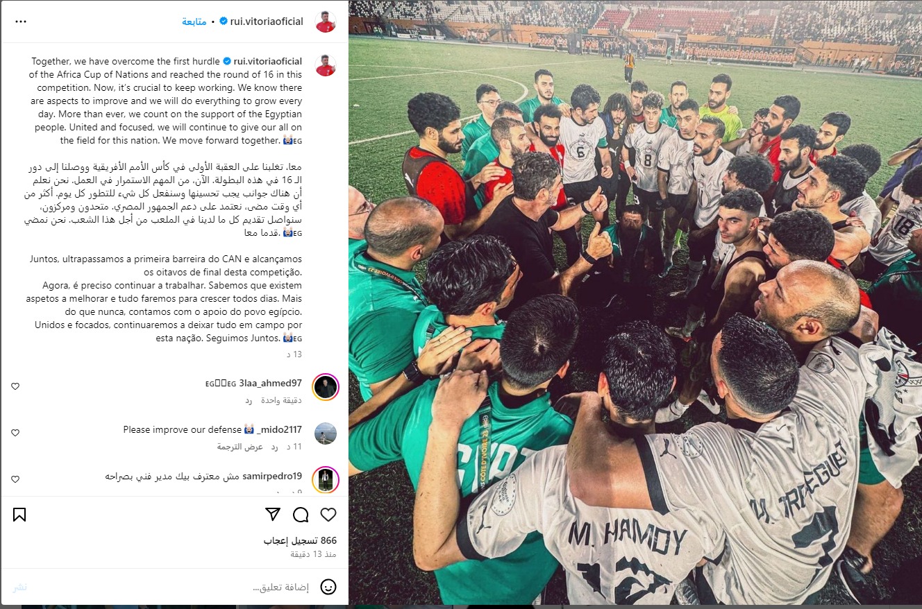 وكتب فيتوريا عبر حسابه الشخصي على انستجرام: “معا تغلبنا على العقبة الأولى في كأس الأمم الأفريقية ووصلنا إلى دور الـ 16 في هذه البطولة.. الآن من المهم الاستمرار في العمل.. نحن نعلم أن هناك جوانب يجب تحسينها وسنفعل كل شيء للتطور كل يوم أكثر من أي وقت مضى، نعتمد على دعم الجمهور المصري.. متحدون ومركزون، سنواصل تقديم كل ما لدينا في الملعب من أجل هذا الشعب.. نحن نمضي قدما معا”.