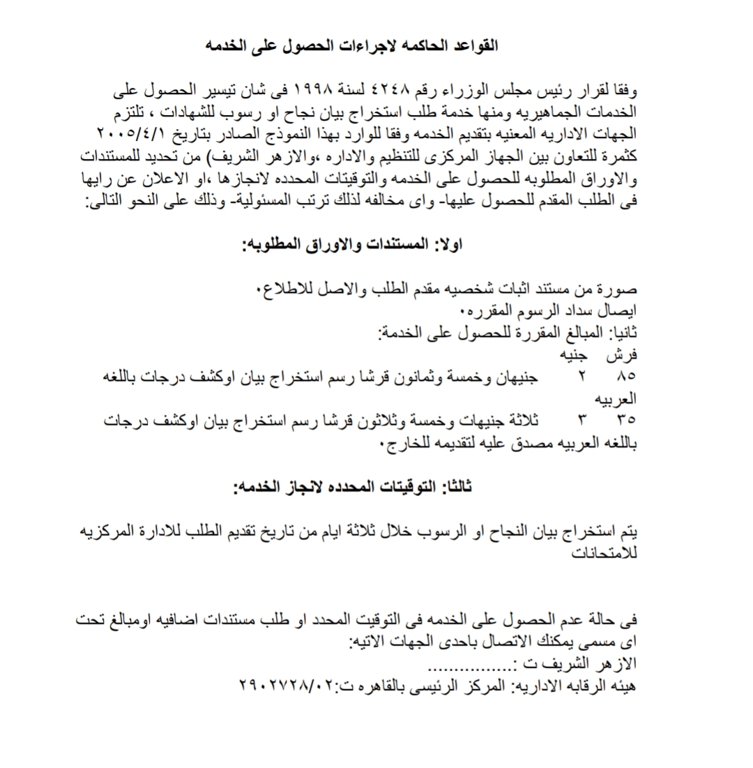 وحول مدة إستخراج بيان نجاح أو رسوب للشهادات بالمعاهد الأزهرية بالمنيا، فمن المتوقع أن يكون خلال ثلاثة ايام من تاريخ تقديم الطلب للادارة المركزيه للامتحانات.