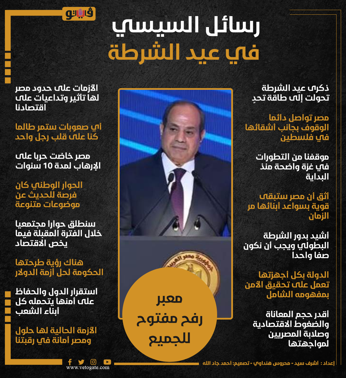 رسائل السيسي في عيد الشرطة (إنفوجراف) الأربعاء 24/يناير/2024 - 03:39 م 1/24/2024 3:39:18 PM الرئيس عبد الفتاح السيسي، فيتو أشرف سيد - محروس هنداوي شارك طباعة 18 حجم الخط شارك طباعة احتفالات عيد الشرطة احتفاليه عيد الشرطة الرئيس عبدالفتاح السيسي أبرز تصريحات الرئيس السيسي رسائل السيسي