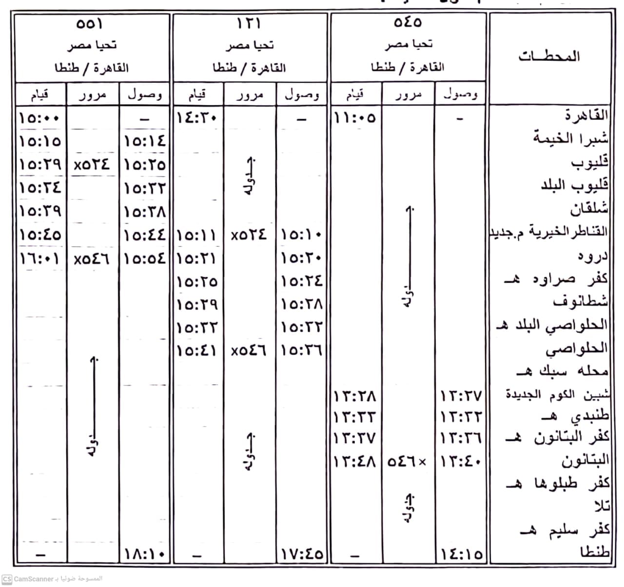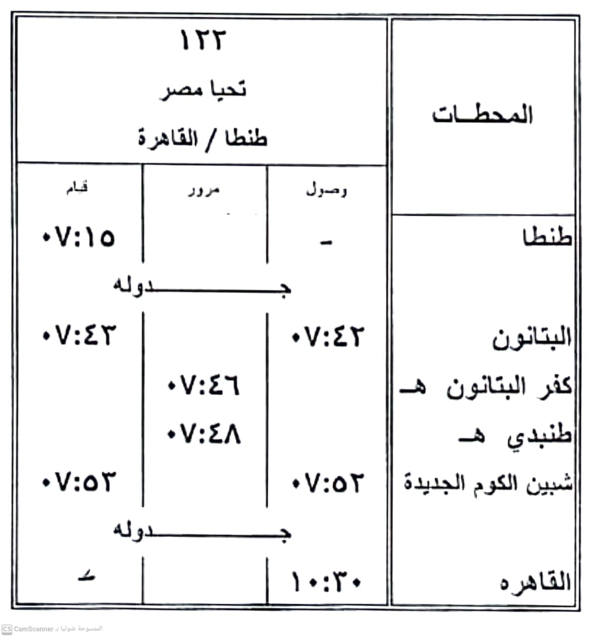 وأشارت الهيئة إلى أنه اعتبارًا من يوم الخميس الموافق 25 / 1 / 2024 يتم تأخير ميعاد قطار 546 ركاب طنطا القاهرة 25 دقيقة ليقوم الساعة 01:15 ظهرًا بدلًا من الساعة 12:50 ظهرًا ويترتب عليه تعديل مواعيد القطارات أرقام ( 545 – 121 – 551 ) تحيا مصر القاهرة / طنطا طبقًا للجداول المرفقة وكذلك اعتبارًا من يوم الإثنين الموافق 29 / 1 / 2024 تقرر وقوف قطار 122 تحيا مصر طنطا / القاهرة بمحطة البتانون طبقًا للجدول المرفق.