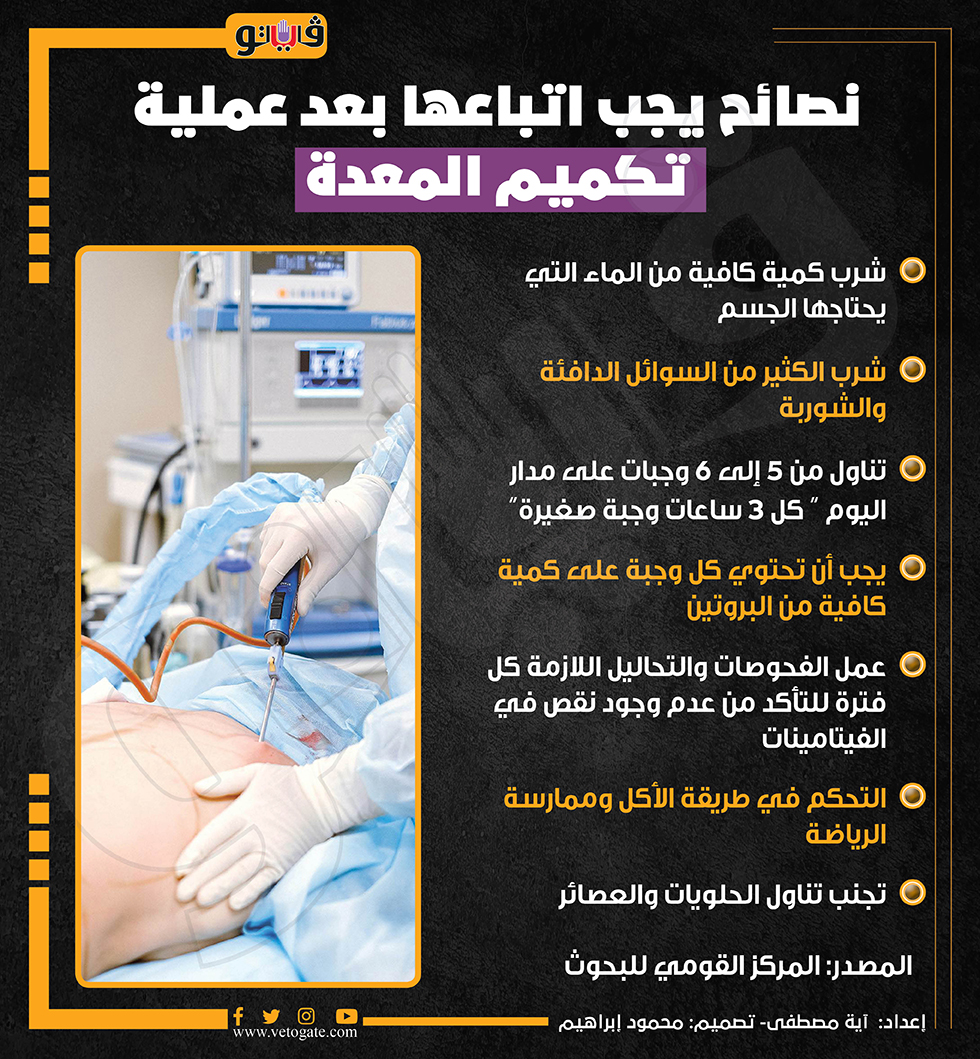 نصائح يجب اتباعها بعد عملية تكميم المعدة (إنفوجراف) السبت 27/يناير/2024 - 06:13 م 1/27/2024 6:13:23 PM تكميم المعدة، فيتو آية مصطفى شارك طباعة 18 حجم الخط شارك طباعة القومي للبحوث تناول الحلويات تكميم المعدة انفوجراف عملية تكميم المعدة ممارسة الرياضة
