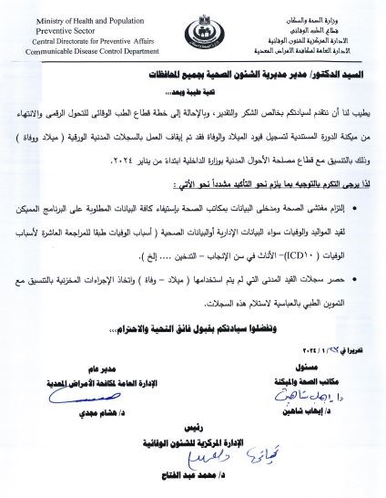 أصدر الدكتور محمد عبد الفتاح رئيس الإدارة المركزية للطب الوقائي بوزارة الصحة خطابا إلى مديريات الشئون الصحية بالمحافظات بشأن خطة قطاع الطب الوقائي للتحول الرقمي والانتهاء من دورة ميكنة تسجيل شهادات الميلاد والوفاة، حيث تم العمل بإيقاف المستندات الورقية لشهادات الميلاد والوفاة بالتعاون مع قطاع مصلحة الأحوال المدنية بوزارة الداخلية من يناير ٢٠٢٤.
