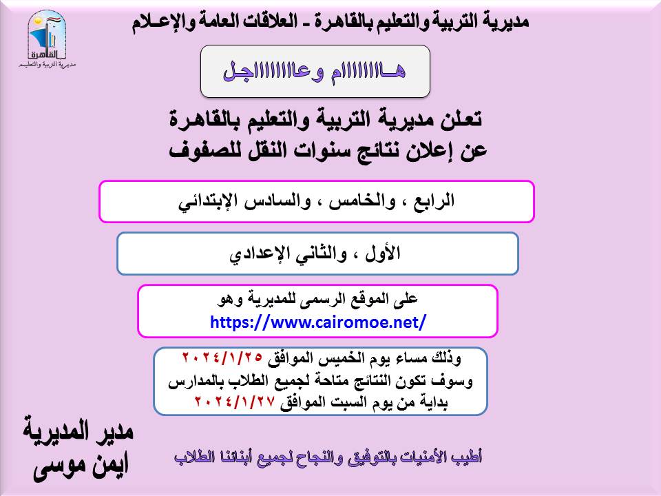 أعلنت مديرية التربية والتعليم بالقاهرة، برعاية أيمن موسى، مدير المديرية عن إعلان نتائج سنوات النقل للصفوف الرابع، الخامس، السادس الإبتدائي والأول والثاني الإعدادي على الموقع الرسمى للمديرية