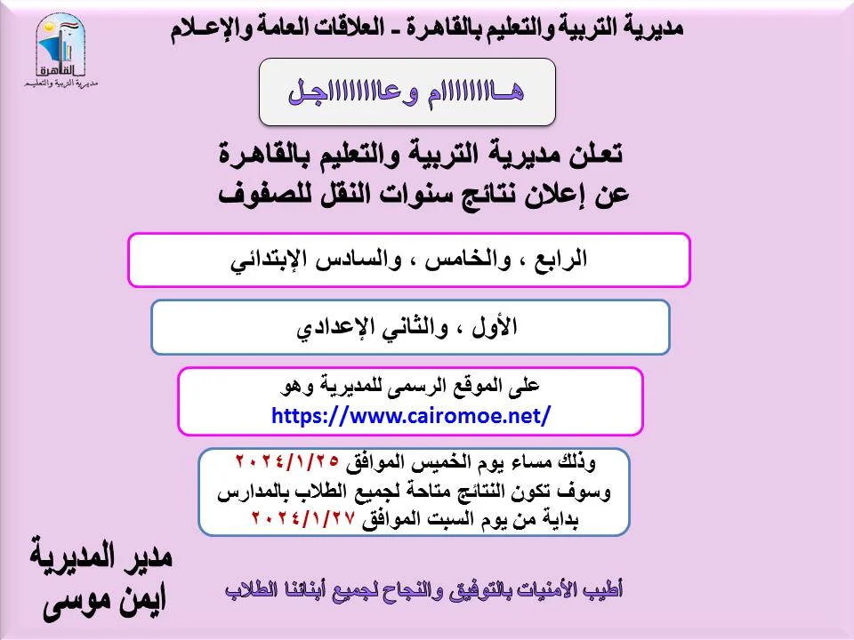 أعلنت مديرية التربية والتعليم بالقاهرة، برعاية أيمن موسى، مدير المديرية عن إعلان نتائج سنوات النقل للصفوف الرابع، الخامس، السادس الابتدائي والأول والثاني الإعدادي على الموقع الرسمى للمديرية وذلك يوم الخميس الموافق ٢٠٢٤/١/٢٥.