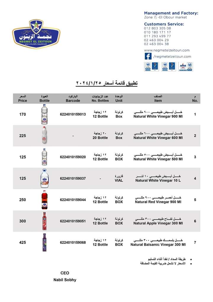 ووفقًأ لما أعلنه عضو الشعبة العامة للمواد الغذائية بالاتحاد العام للغرف التجارية؛ فإن أسعار الخل الأبيض الطبيعي بعد الزيادة التي ستطبق من اليوم الخميس، جاءت كالتالي: