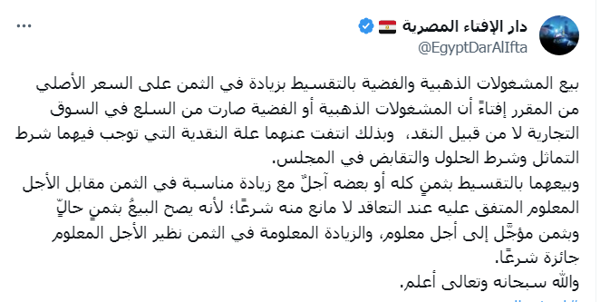 وقالت دار الإفتاء المصرية عن بيع المشغولات الذهبية بالتقسيط بالزيادة في سعر: "بيع المشغولات الذهبية والفضية بالتقسيط بزيادة في الثمن على السعر الأصلي من المقرر إفتاءً أن المشغولات الذهبية أو الفضية صارت من السلع في السوق التجارية لا من قبيل النقد، وبذلك انتفت عنهما علة النقدية التي توجب فيهما شرط التماثل وشرط الحلول والتقابض في المجلس."