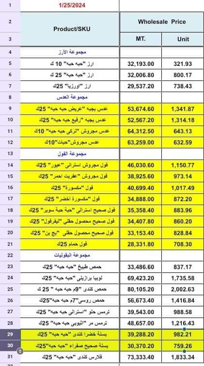 وجاءت أسعار الحبوب والبقوليات في الأسواق خلال الأسبوع الأخير من يناير الجاري، كالتالي: