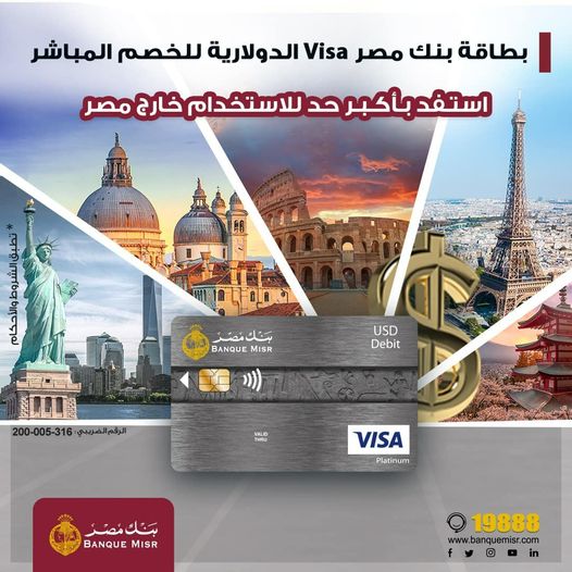 يقدم بنك مصر لعملائه فيزا الخصم المباشر الدولارية التي تمنح أعلي حد سحب خارج مصر.