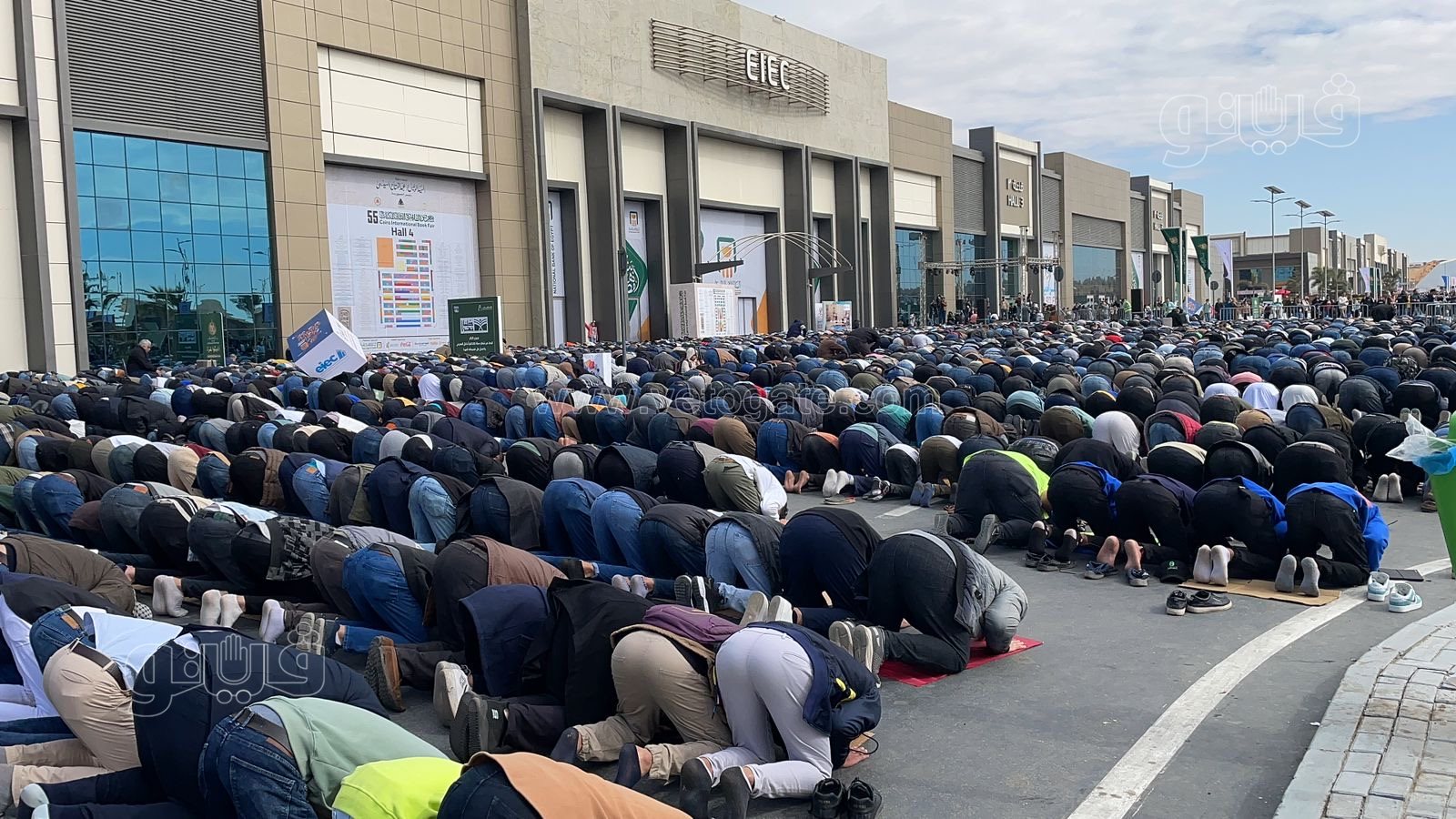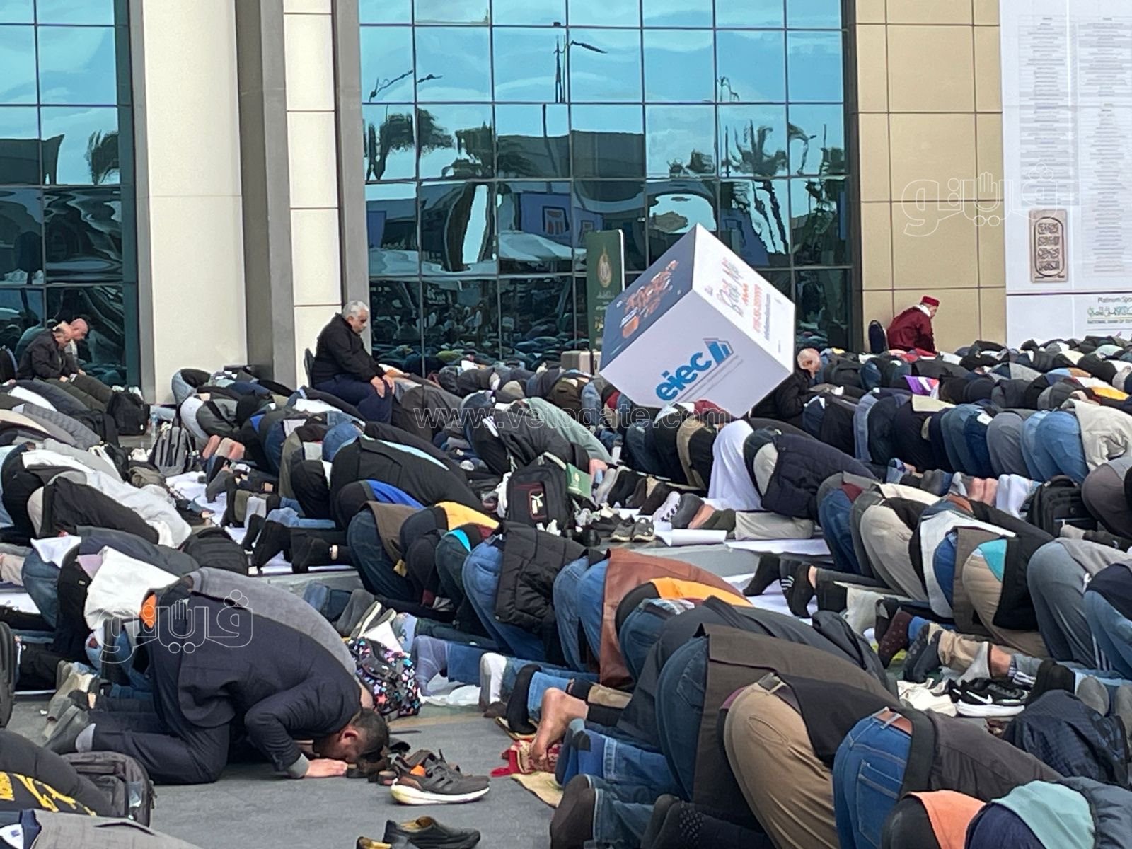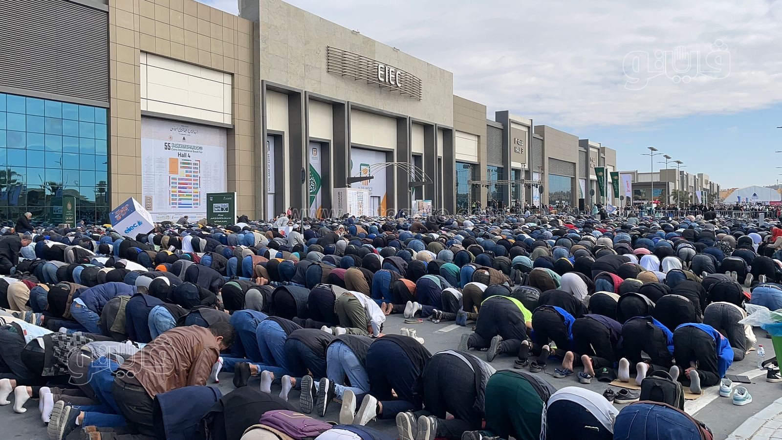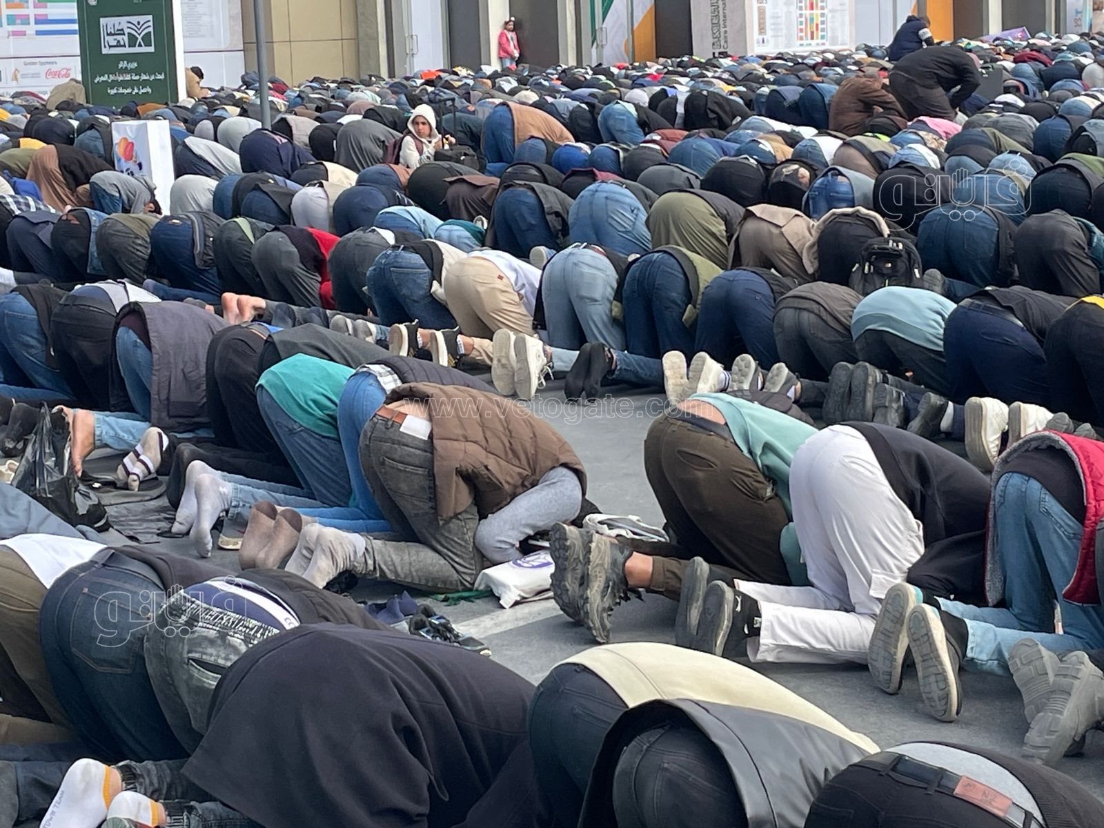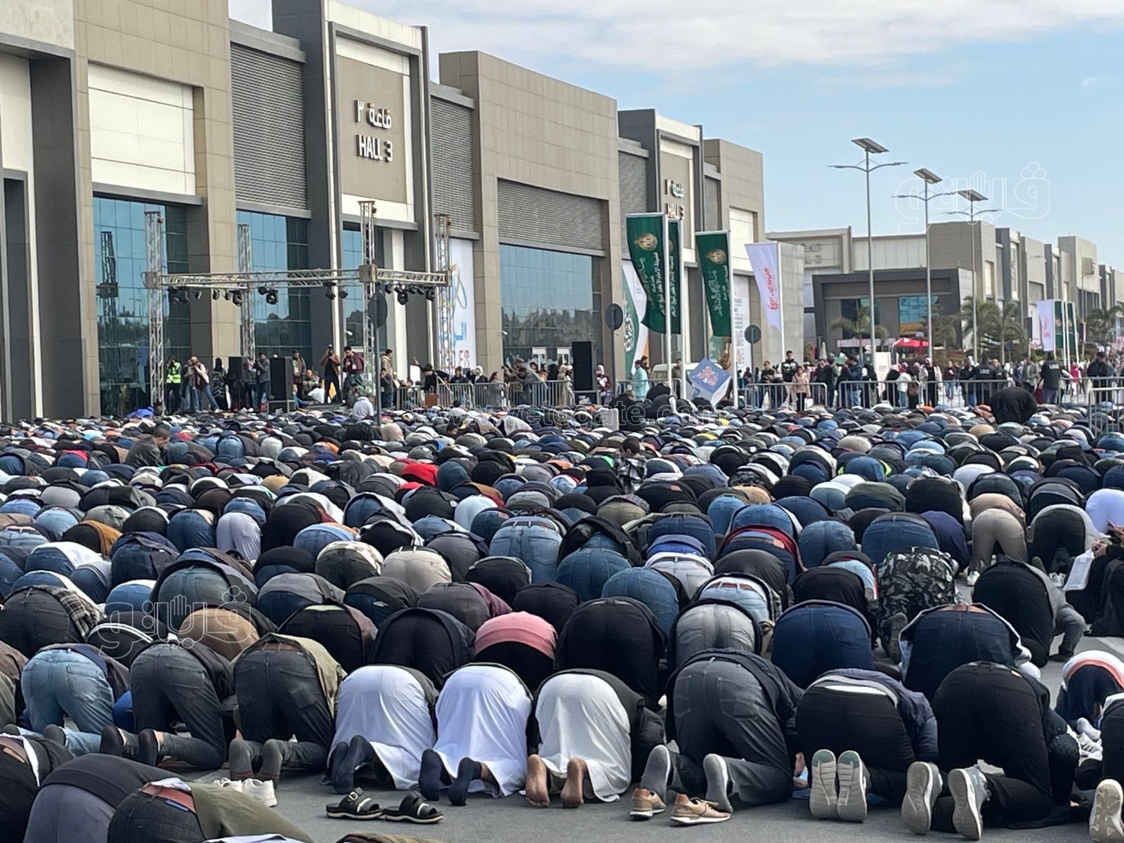 جمهور معرض الكتاب يؤدي صلاة الجمعة أمام القاعات (فيديو وصور)