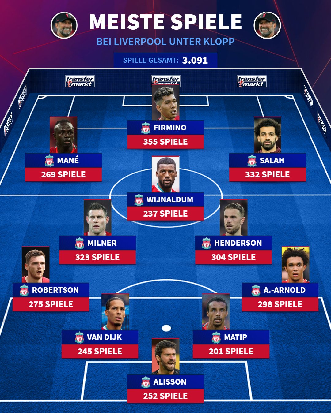 ويتواجد النجم المصري محمد صلاح ضمن قائمة أكثر اللاعبين خوضا للمباريات تحت قيادة كلوب برصيد 332 مباراة.
