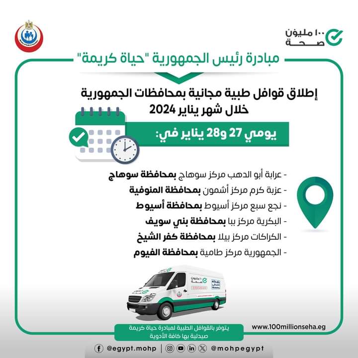 أعلنت وزارة الصحة إطلاق ٦ قوافل طبية ضمن مبادرة رئيس الجمهورية حياة كريمة يومي ٢٧ و٢٨ يناير ٢٠٢٤ للكشف والعلاج مجانًا في التخصصات الطبية نساء وولادة - خدمات تنظيم الأسرة - الأطفال والباطنة - الأنف والأذن والعظام - الجراحة - الرمد الأسنان - القلب - الجلدية وخدمات الأشعة والتحاليل.
