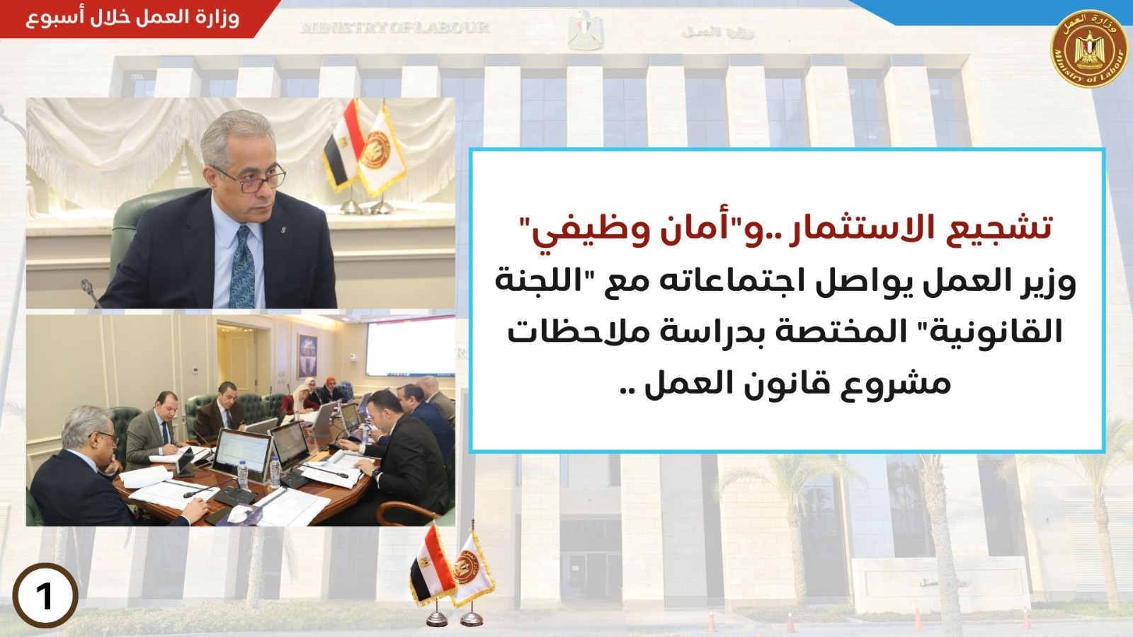 واصل حسن شحاتة وزير العمل اجتماعاته مع" اللجنة القانونية" المختصة بمتابعة ملاحظات مشروع قانون العمل..وترأس الوزير ،اجتماع "اللجنة"، بمقر "الوزارة" بالعاصمة الإدارية الجديدة، لبحث ودراسة الملاحظات، والآراء الواردة على مشروع قانون العمل،من ممثلي طرفي العملية الإنتاجية"منظمات أصحاب الأعمال والعمال"،ومجلس الشيوخ،في اطار خطة زمنية لمناقشة بنود "المشروع"،التي تصل إلى 265 مادة، تمهيدًا لعرضها على "المجلس الأعلى للحوار الاجتماعي في مجال العمل"، في دورة انعقاده القادمة، تزامنًا، أو قبل مُناقشتها وإقرارها من مجلس النواب.