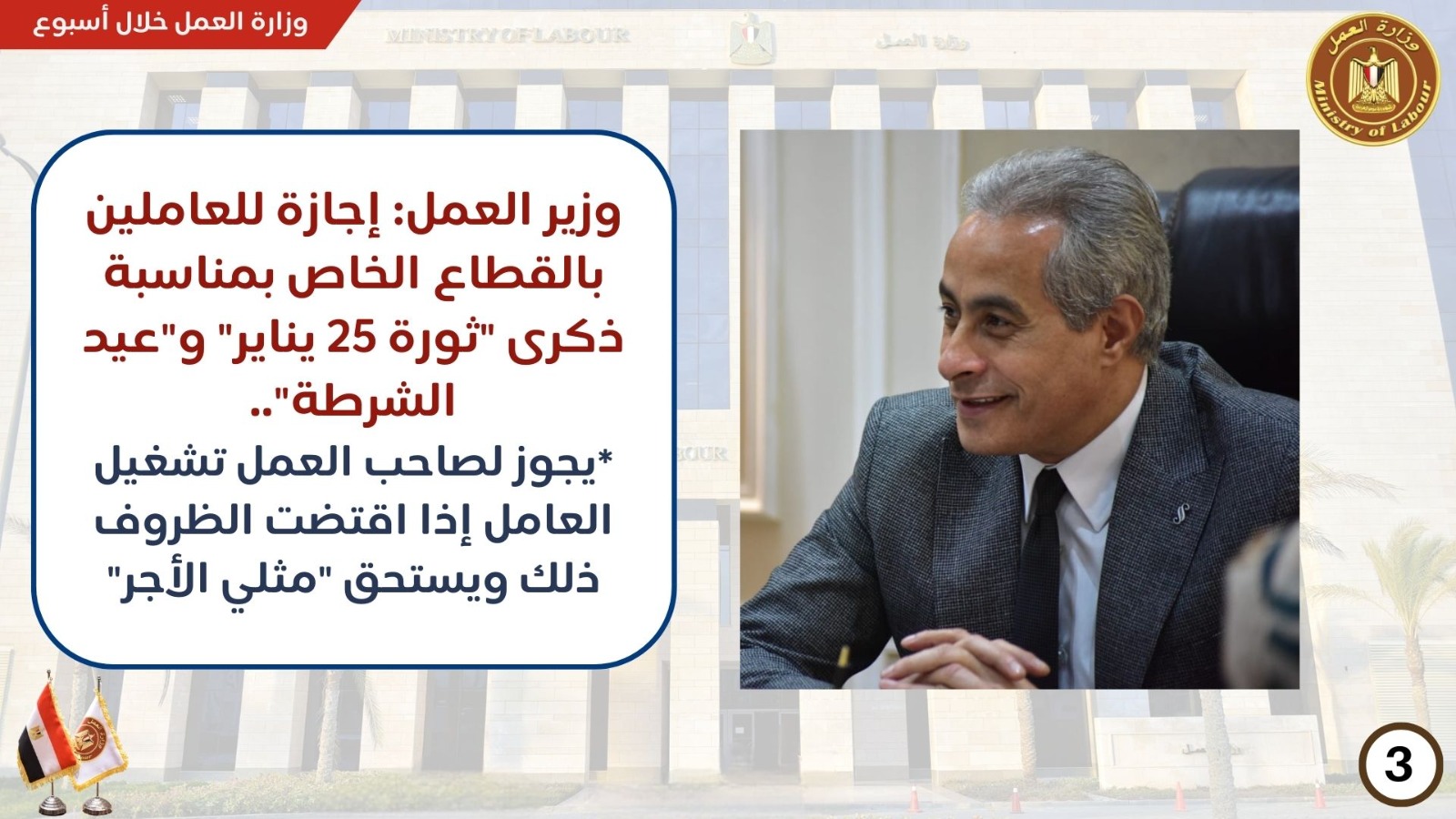 وخلال الأسبوع أعلن وزير العمل حسن شحاتة في بيان، أن يوم الخميس الماضي الموافق 25 يناير 2024، إجازة رسمية بمناسبة بمناسبة ذكرى ثورة 25 يناير، وعيد الشرطة، وإعتباره إجازة رسمية مدفوعة الأجر للعاملين بالقطاع الخاص المخاطبين بأحكام قانون العمل رقم 12 لسنة 2003،وذلك في ضوء نص قرار رئيس مجلس الوزراء رقم 145 لسنة 2024 والذي نص على أن: " يوم الخميس الموافق 25 يناير 2024 إجازة رسمية مدفوعة الأجر للعاملين في الوزارات والمصالح الحكومية والهيئات العامة ووحدات الإدارة المحلية وشركات القطاع العام وشركات القطاع الخاص وشركات قطاع الأعمال العام، وذلك بمناسبة ذكرى ثورة 25 يناير وعيد الشرطة.