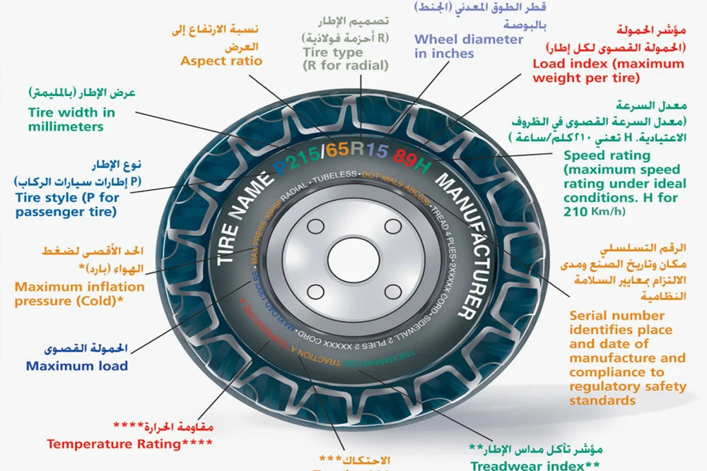 تُكتب مقاسات إطارات السيارات على شكل سلسلة من الأرقام والحروف.