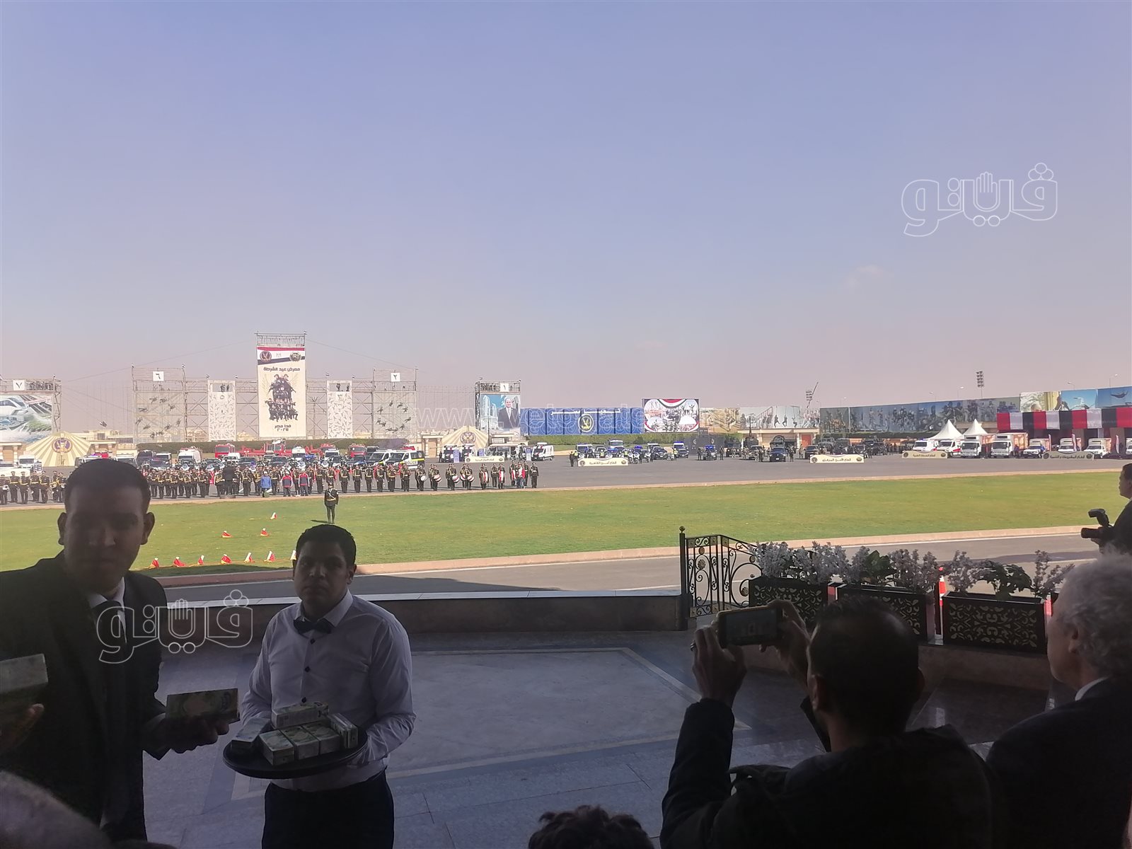 وبدأ الاحتفال بعزف الموسيقات العسكرية المقطوعات الوطنية وأذاعة الأغاني الوطنية.