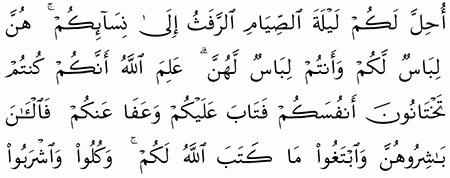 قال الشيخ محمد متولي الشعراوي: إن قول الحق سبحانه وتعالى في سورة البقرة: «أُحِلَّ لَكُمْ لَيْلَةَ الصِّيَامِ الرَّفَثُ إِلَىٰ نِسَائِكُمْ» (الآية: 187)، يعني أنه طالما قال عز وجل (أُحل)، أي أنه كان محرمًا عليهم الرفث إلى نسائهم ليلة الصيام، إذن فتشريع الصوم بدأ بأن تصوم وتمسك بالنهار عن شهوتي البطن والفرج، وأنك عندما يأتي الليل تأكل وإذا نمت لا تأكل بعدها، حتى ولو ما زلت في الليل وحتى ولو لم تفطر.