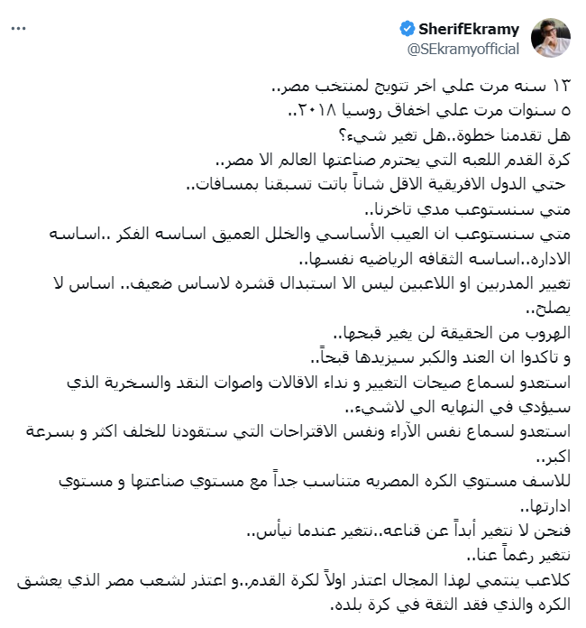وتابع شريف إكرامي قائلًا: "حتى الدول الإفريقية الأقل شانًا باتت تسبقنا بمسافات.. متى سنستوعب مدى تأخرنا.. متى سنستوعب أن العيب الأساسي والخلل العميق أساسه الفكر.. أساسه الإدارة.. أساسه الثقافة الرياضية نفسها..".